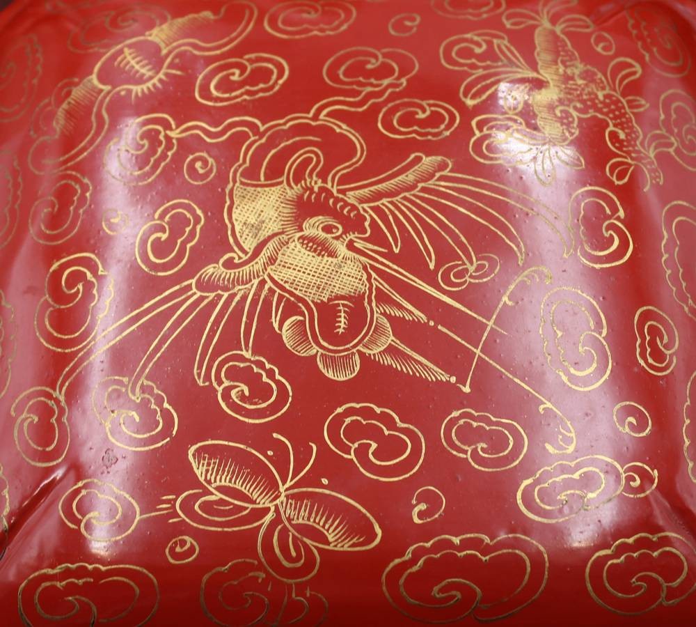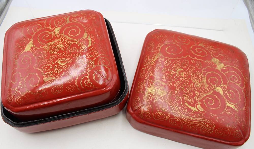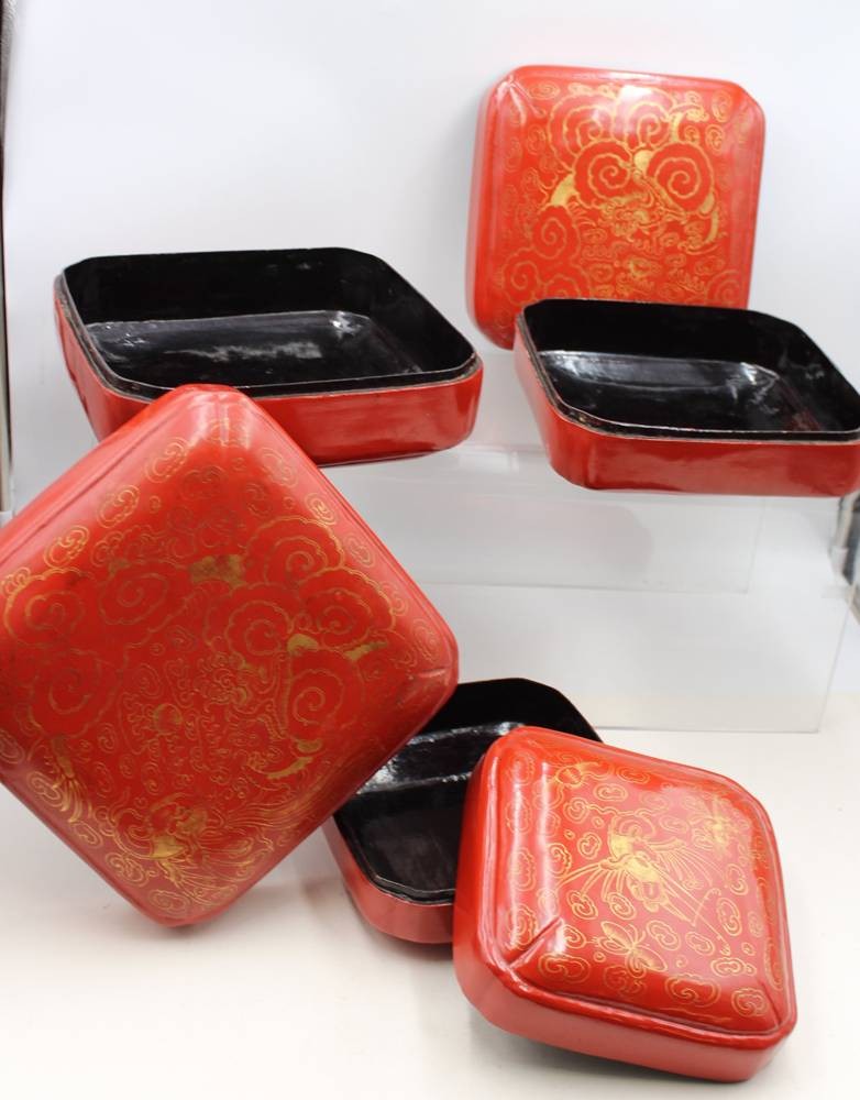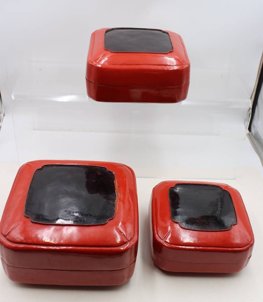 3er Satz Lackkästen, wohl China, je mit Goldzier, ca. Größter 14 x 27 x 27cmm 1x Lack beschädigt [1]
