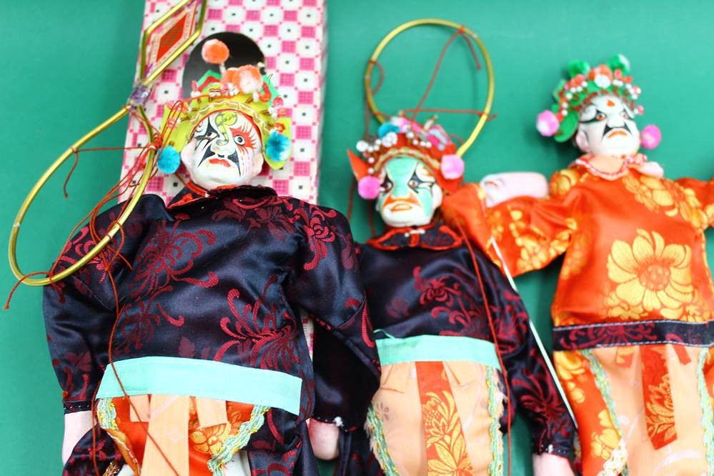 3x chinesische Marionetten (Opern-Figuren), max. H- 27cm (je in Schachtel)