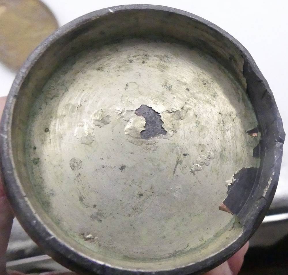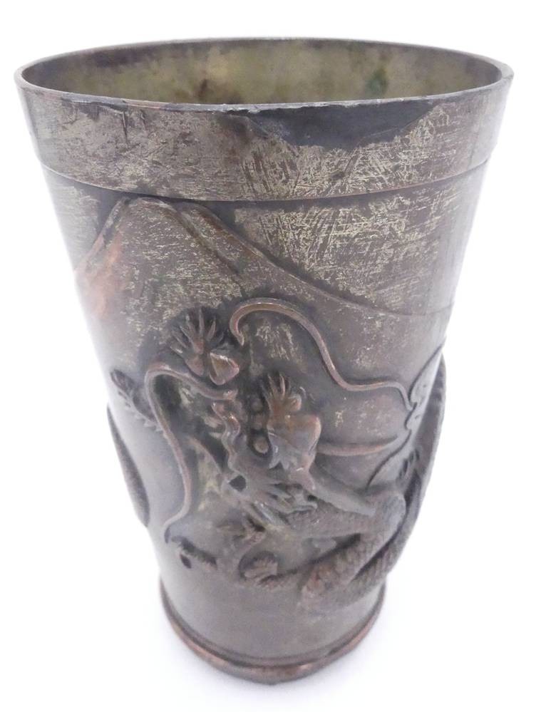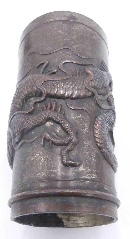 alter, massiver Kupferbecher mit Drachenrelief, China, 19.Jhd??, H-12 cm, ca. 415 gr, Altersspuren [1]