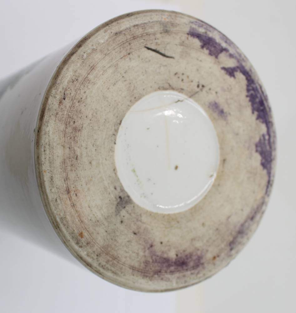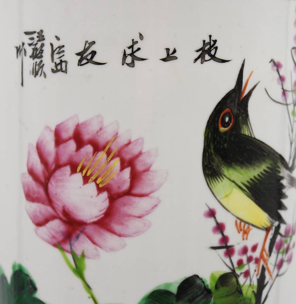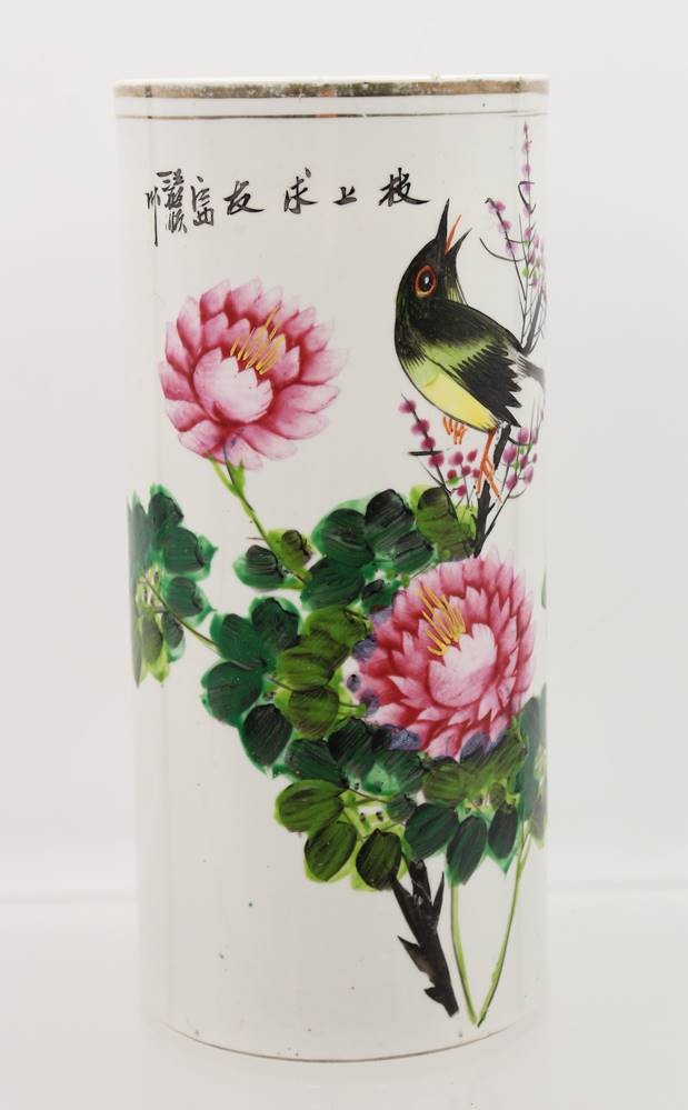 antiker Pinselhalter mit Vogel-u. Blumenbemalung sowie Schriftzeichen, Boden altrissig, H-27cm