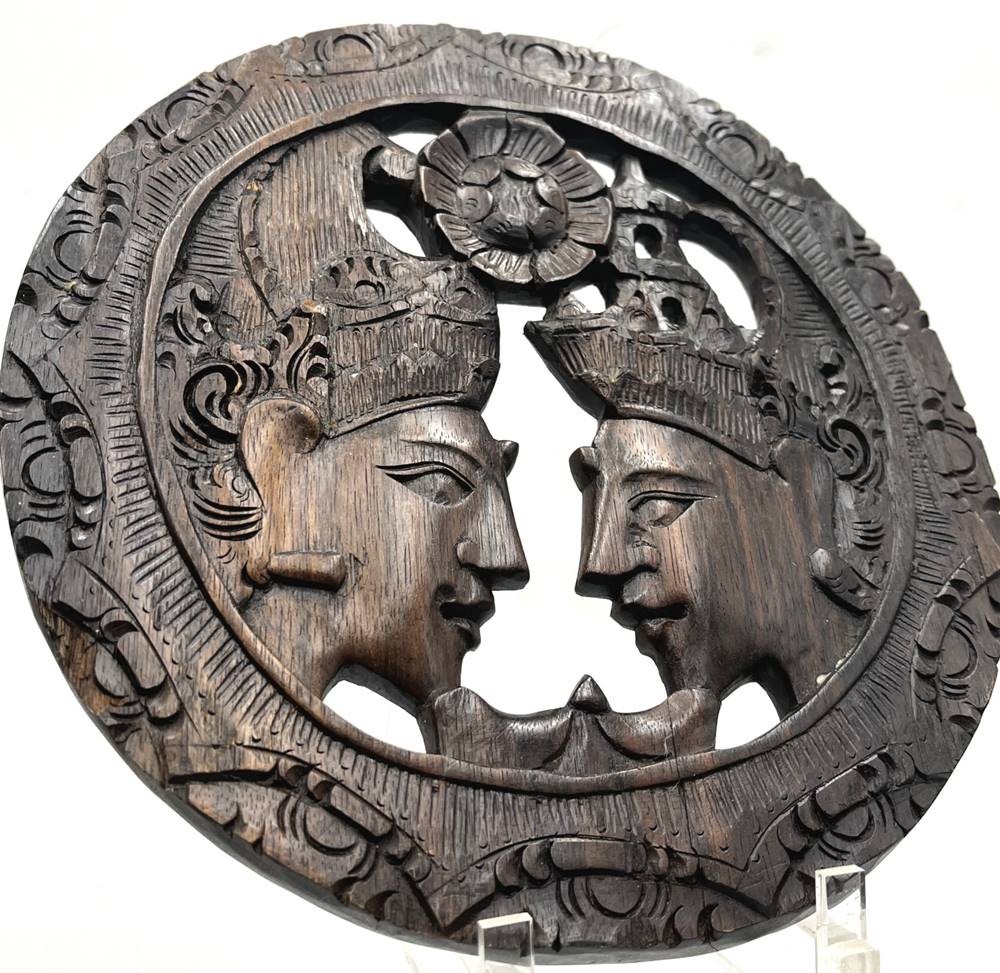 Bali Schnitzerei, 2 Gesichter, Holz, rund