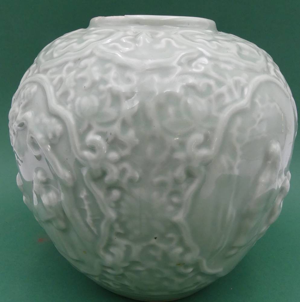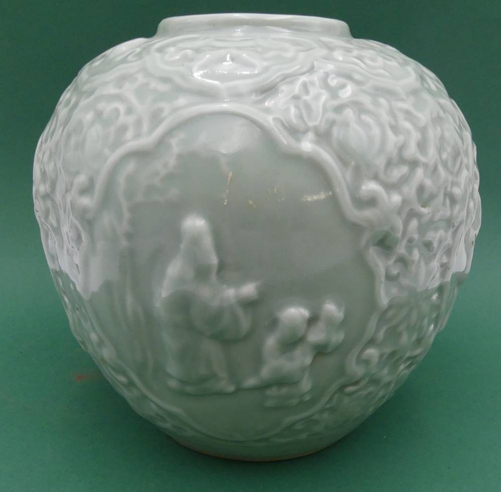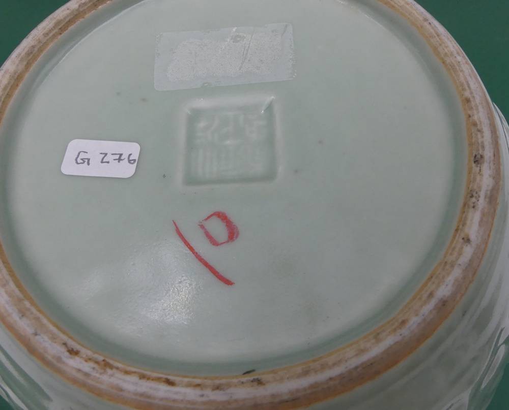 bauchige Chinavase, seladon mit Reliefdekor, chin. gemarkt, H-20 cm, D-20 cm [1]
