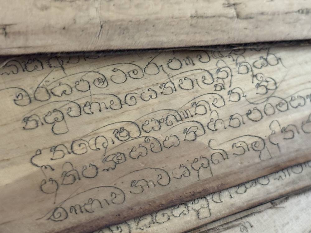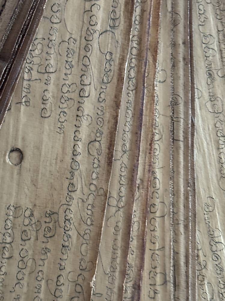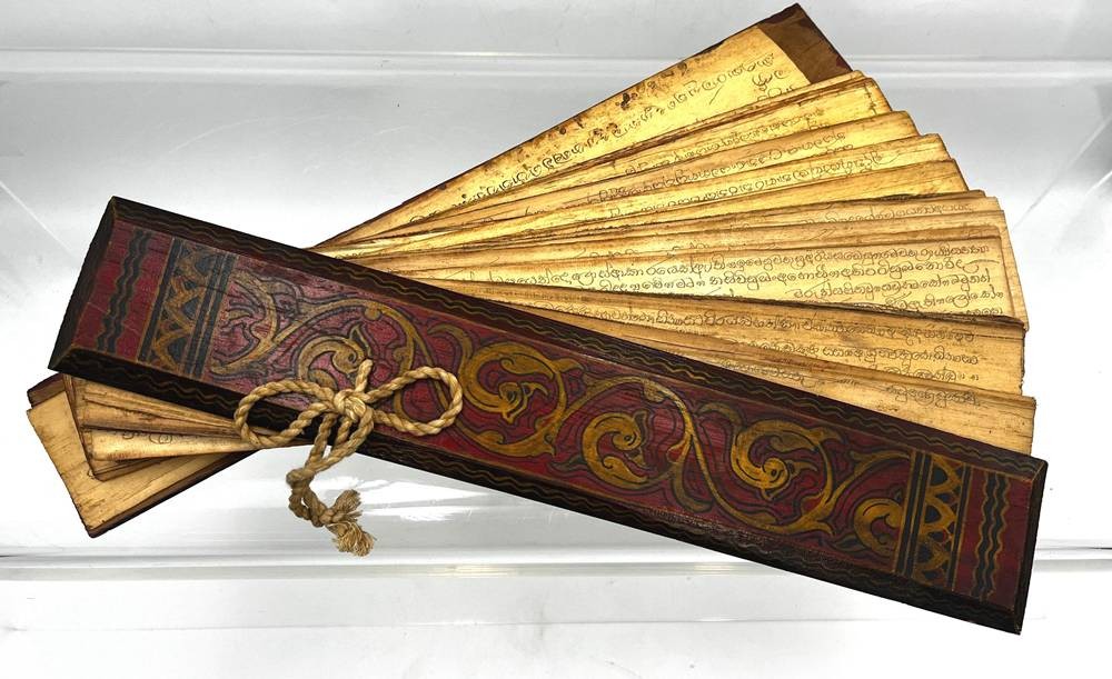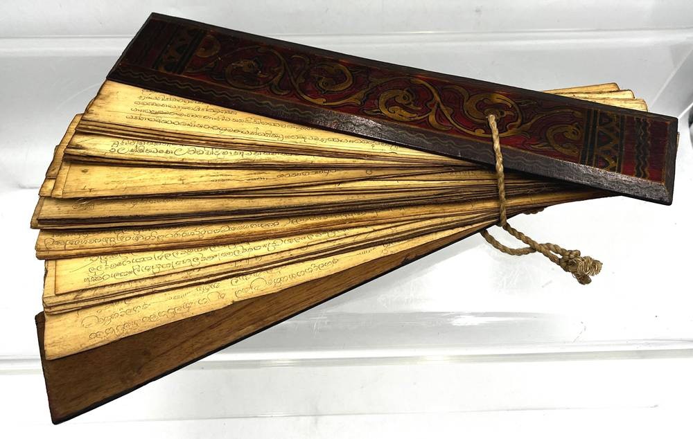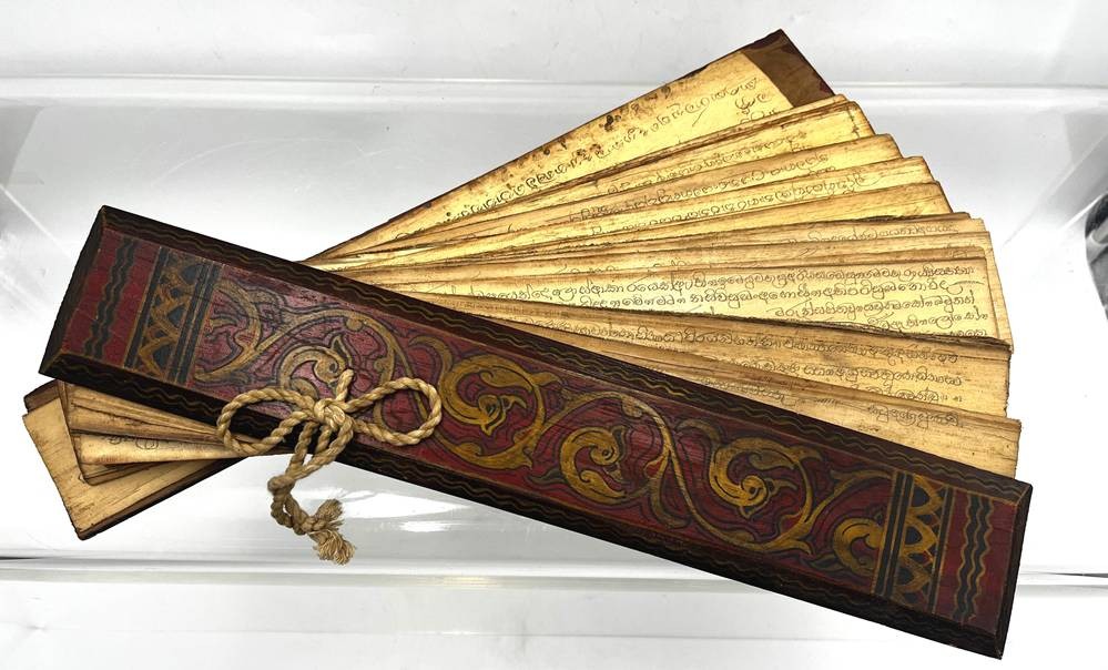 Buddhistisches Palmblatt-Manuskript, Thailand 19. Jh. ?, Deckblätter aus bemalten Holz, 35x6,5 cm [1]