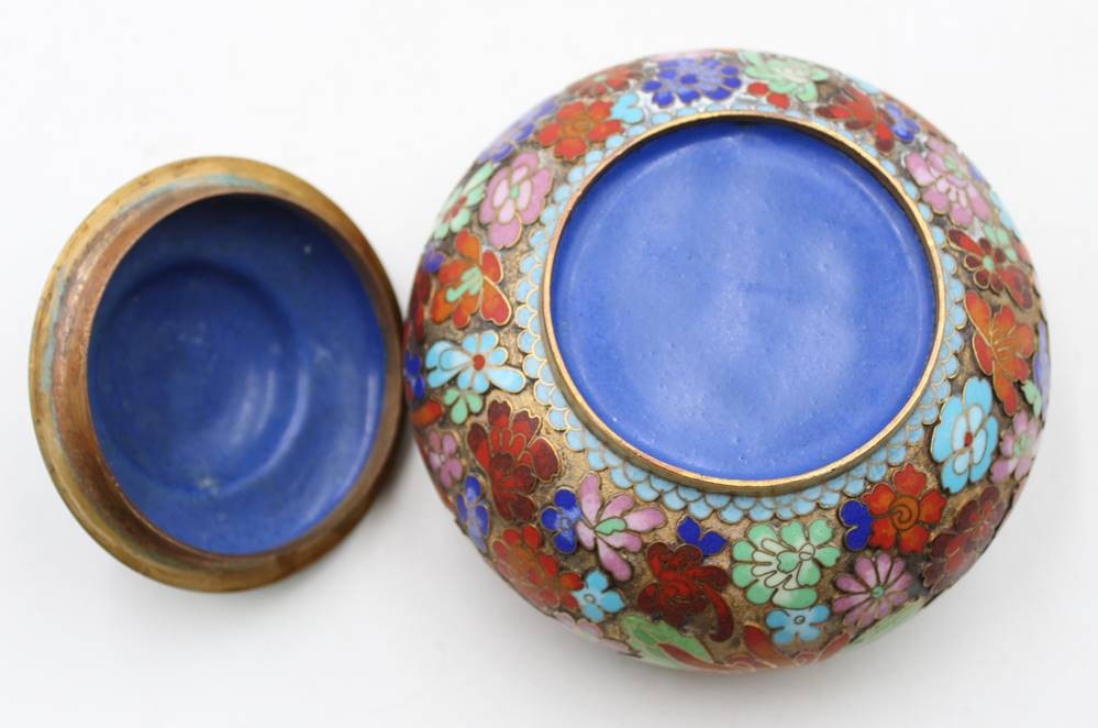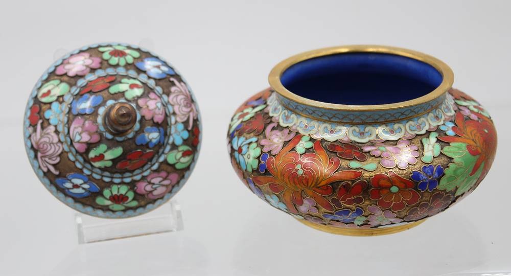 Cloisonné-Deckeldose, China, florales Dekor, ca. H-10,5cm D-12,5cm [1]