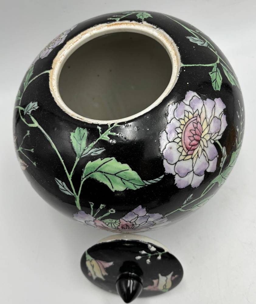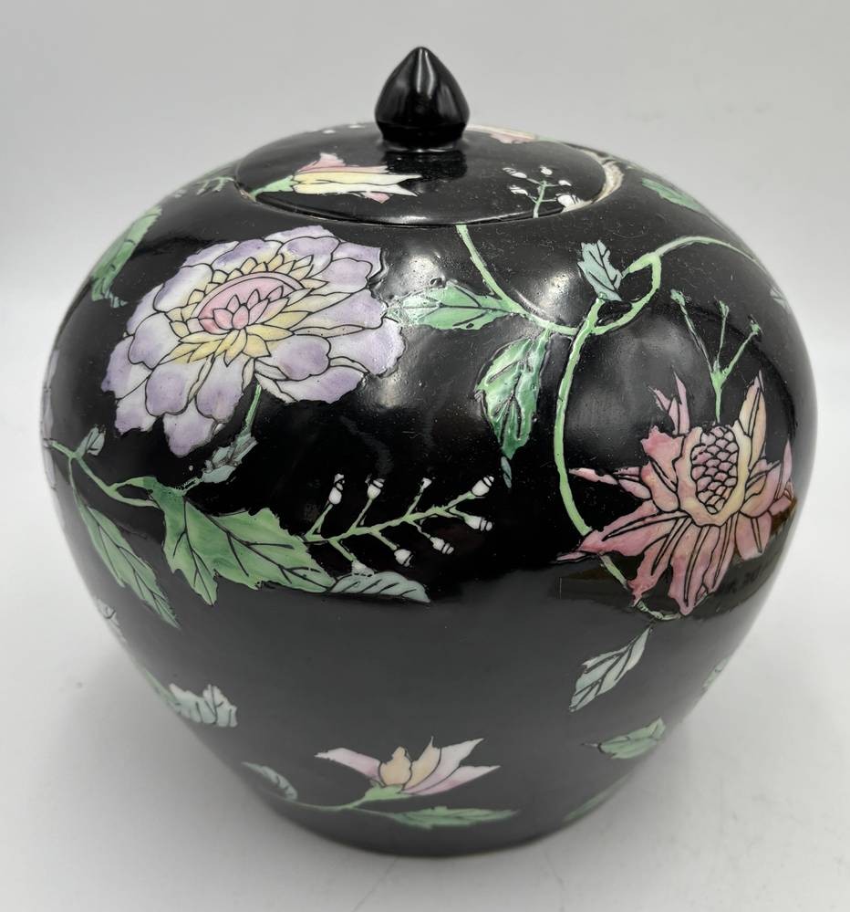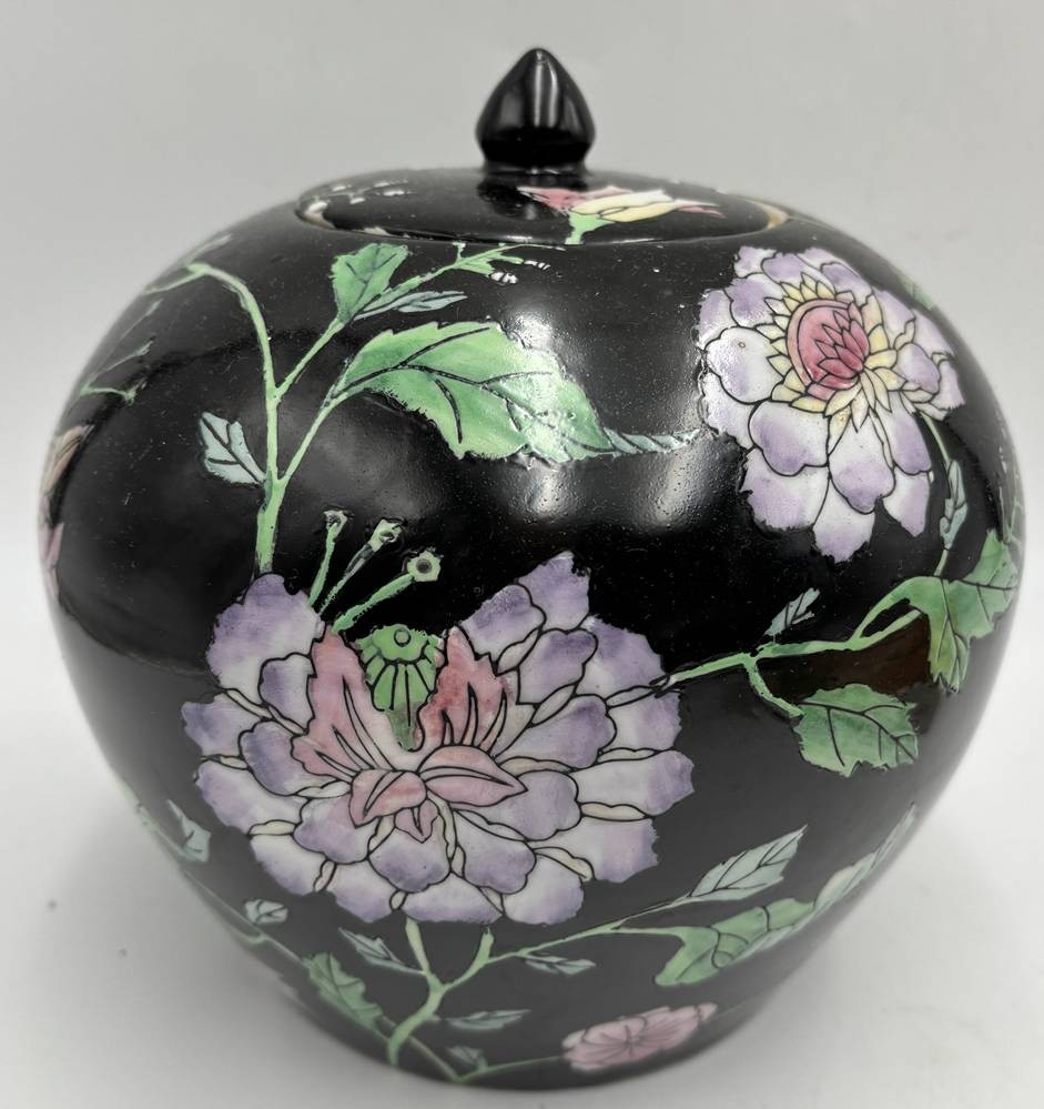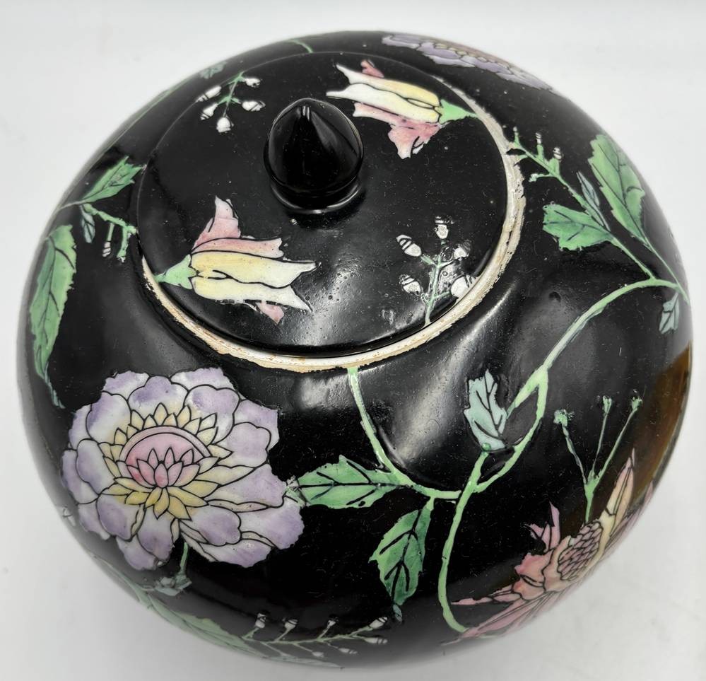 Famille-Noir-Porzellan-Deckelvase. Ingwer Topf (Ginger Jar) mit Emaillefarben bemalt, in Boden chines. Marke, H-18 cm, D-18 cm