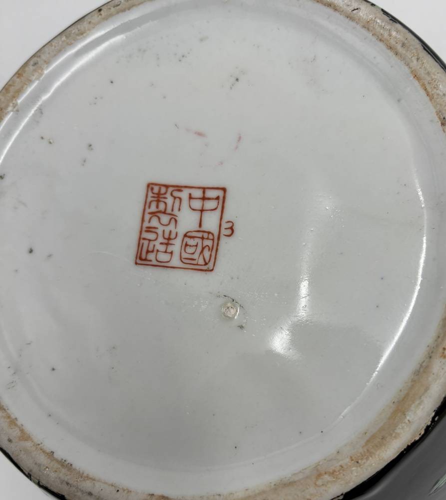 Famille-Noir-Porzellan-Deckelvase. Ingwer Topf (Ginger Jar) mit Emaillefarben bemalt, in Boden chines. Marke, H-18 cm, D-18 cm [1]