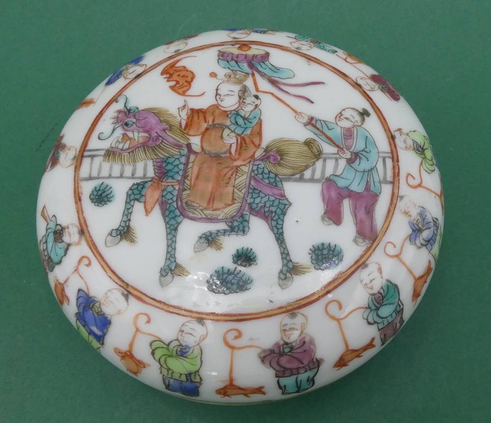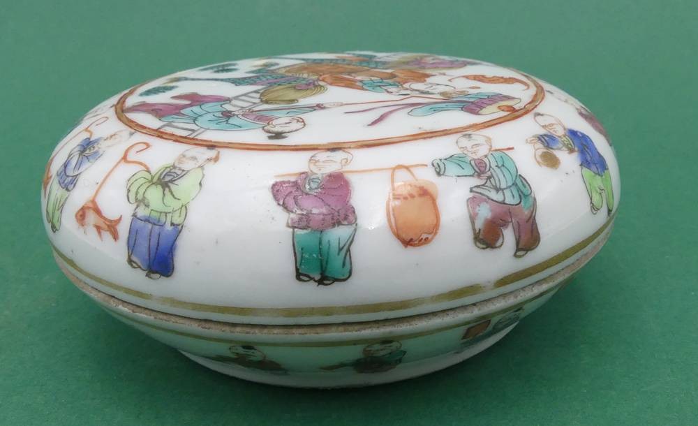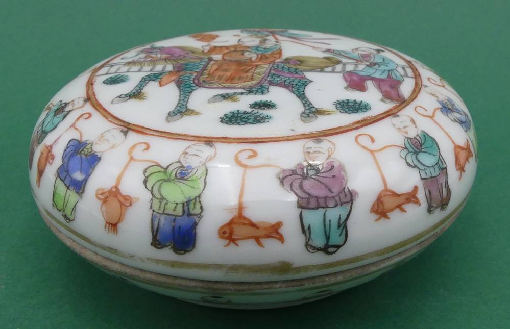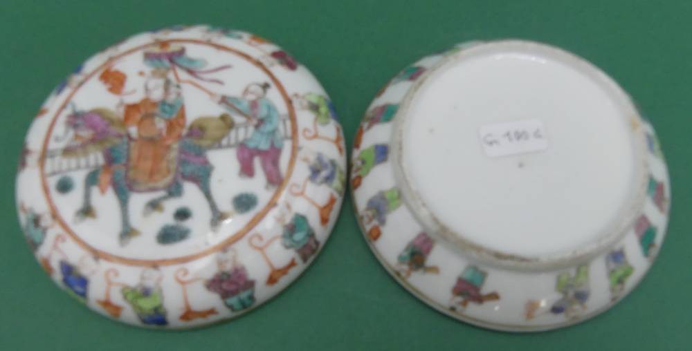flache Porzellan-Dose mit figürl. Dekor, H-3,5 cm, D-10 cm [1]