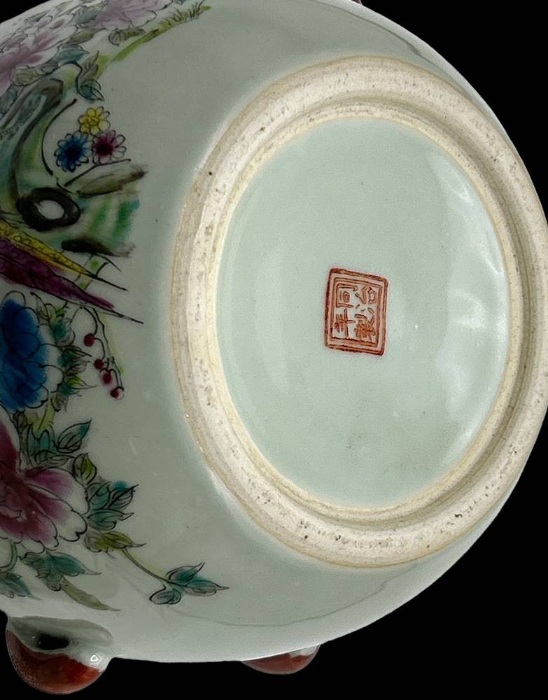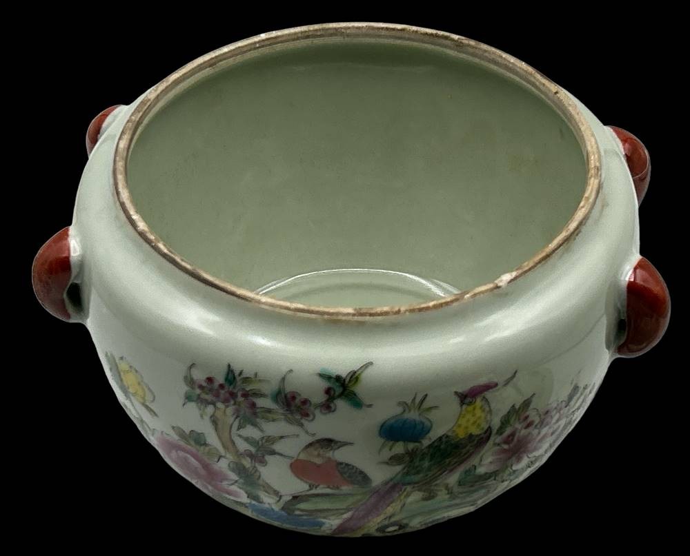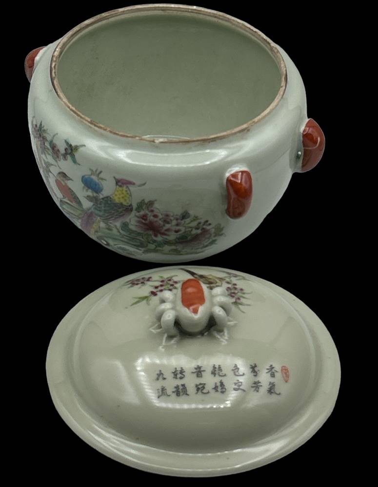 gr. Deckelgefäss, bemalt mit Vögel, China, rote Bodenmarke, Spinne als Deckelbekrönung, chines. beschr5iftet, H-ca. 16 cm, D-ca. 18 cm, Innenrand minimale Abplatzer [1]