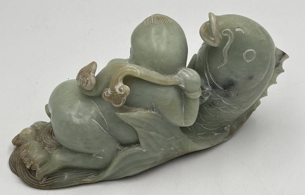 gr. Jade Schnitzerei, Chinese mit Fischen, H-13 cm, L-24 cm [1]