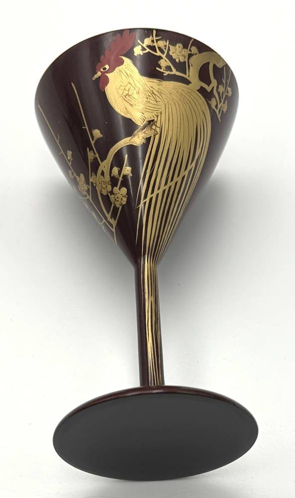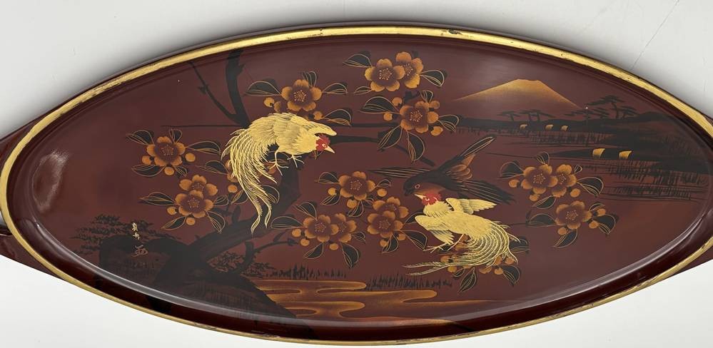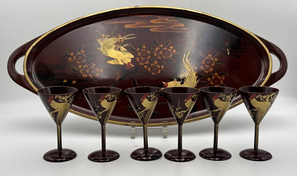 gr. Lacktablett mit 6 Likör/Cocktailschalen, bemalt mit Fantasie-Vögel vor Fujiyama, Tablett 54x26 cm, H-Shalen 11 cm, Japan [1]