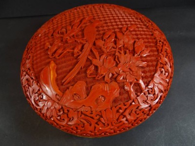 grosse Rotlack-Deckeldose, Messing, innen schwarz , China, H-9,5 cm, D-21 cm [1]