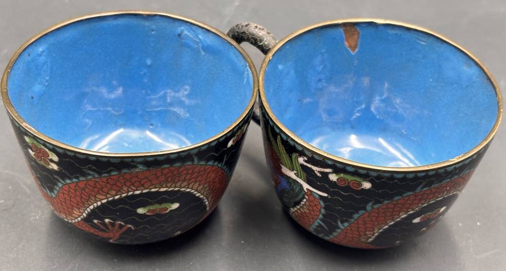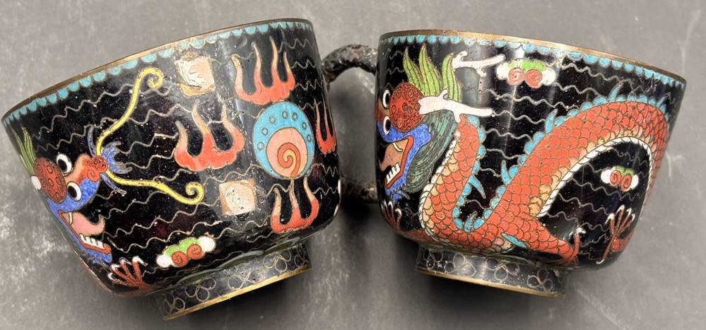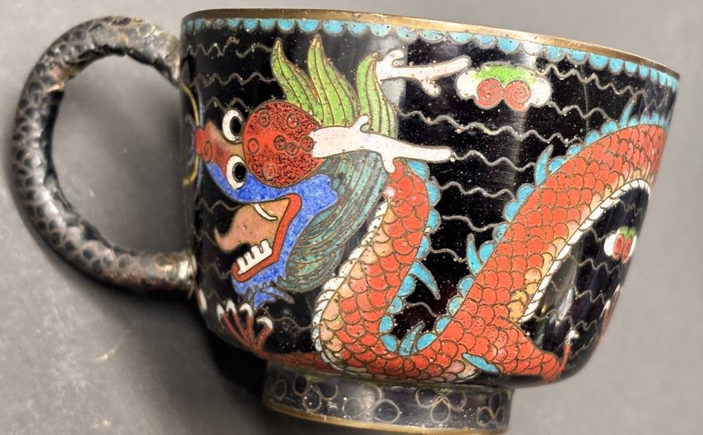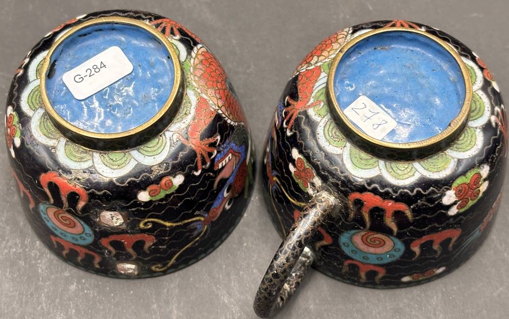 Henkeltasse und Koppchen, Cloisonne mit Altersspuren, China, innen Abplatzer, beide Drachendekor [1]