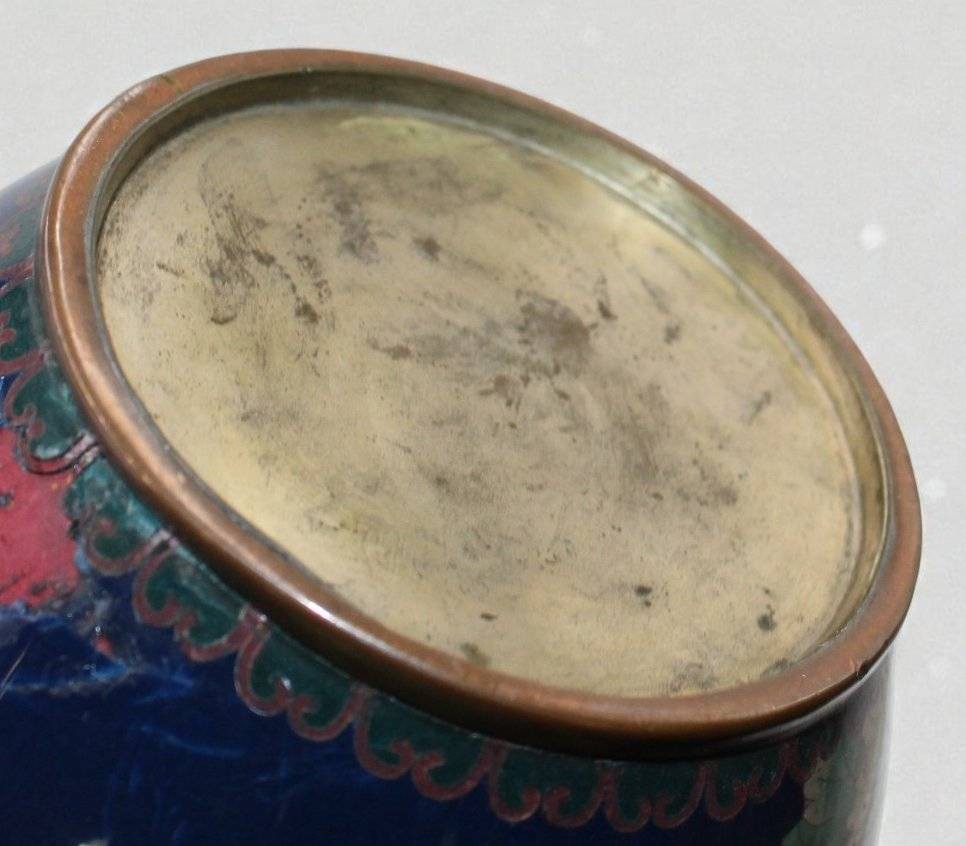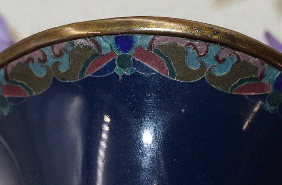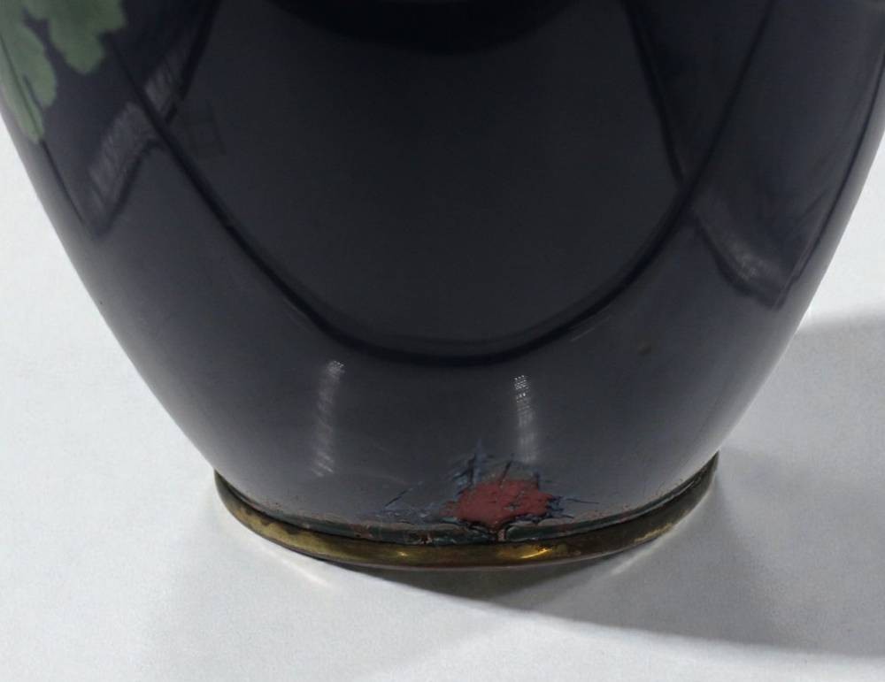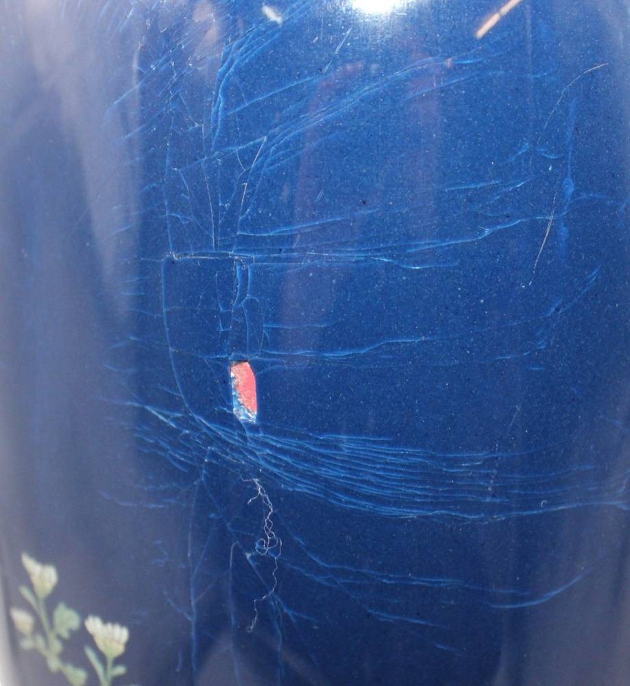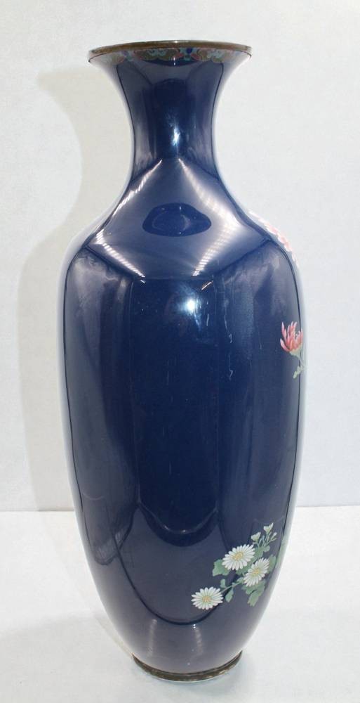 hohe Cloisonné-Vase, Japan, Meji-Zeit, Blumen auf blauem Grund, leider Emaille 3x bestossen, ca. H-45cm [1]