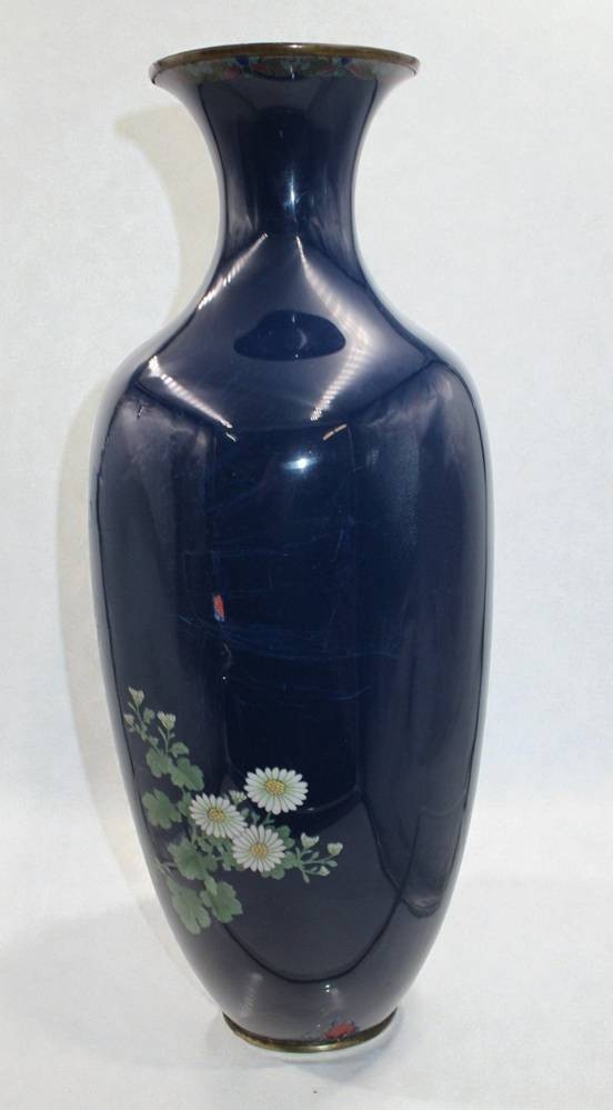 hohe Cloisonné-Vase, Japan, Meji-Zeit, Blumen auf blauem Grund, leider Emaille 3x bestossen, ca. H-45cm
