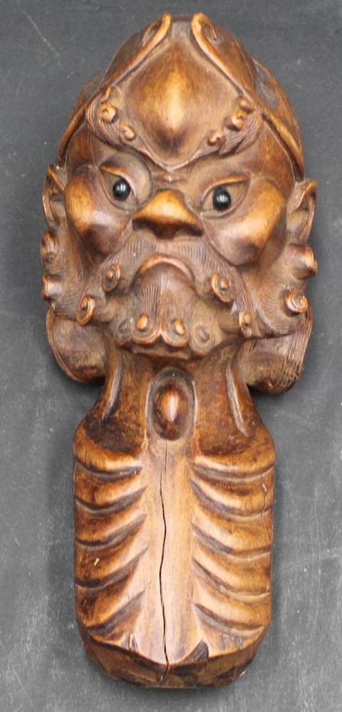 Holz-Wandkopf, wohl Japan 18/19.Jhd., Museums-Inventuraufkleber, wohl aus DDR-Museum H-21 cm