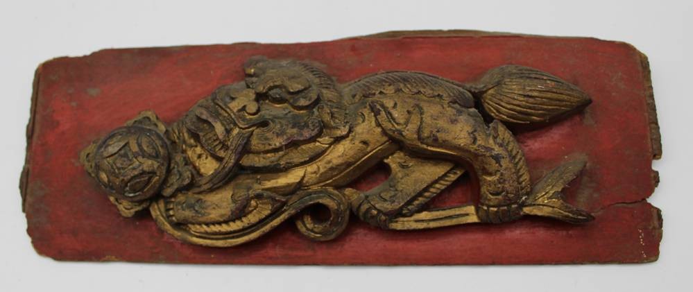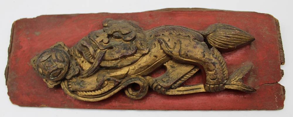 kl. Holzbrett mit Drachenschnitzerei, wohl Möbelfüllung?, Alter?, 25x9 cm [1]