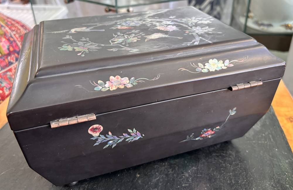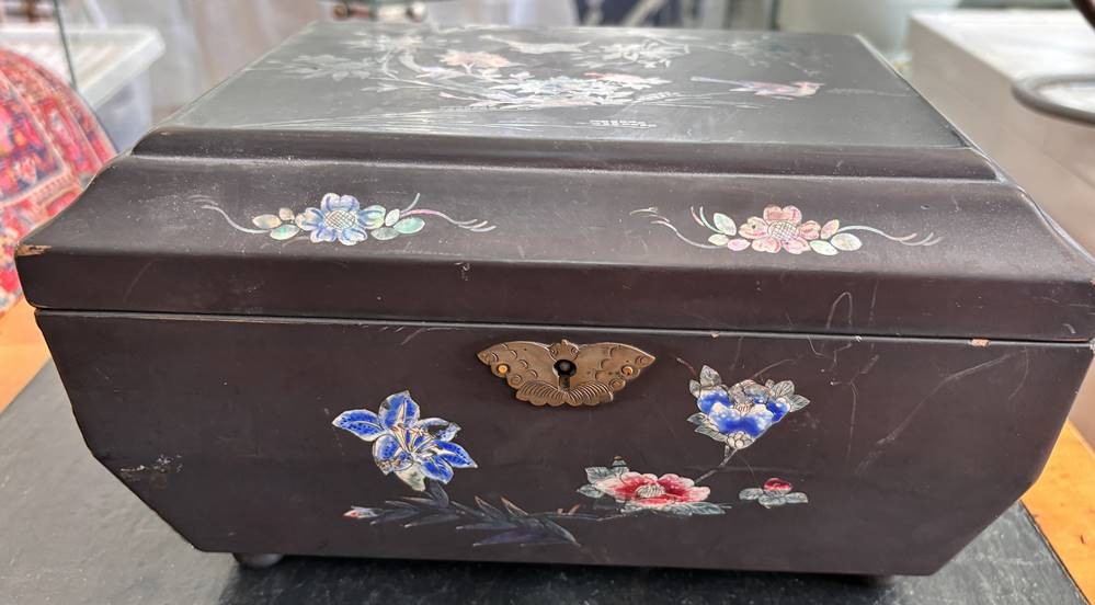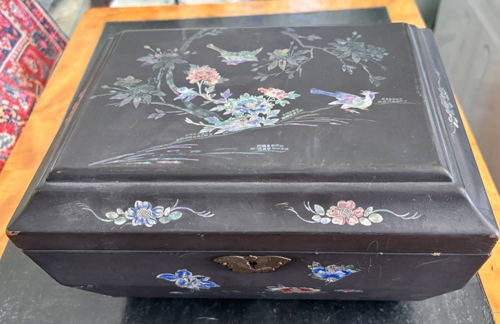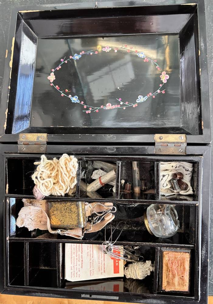 Lack-Nähkasten mit floralen Dekor, oberes Einsatz mit Einteilung, etwas Inhalt, Deckel mit Perlmutteinlagen, Vögel auf Zweigen, H-13 cm, 24x18 cm [1]