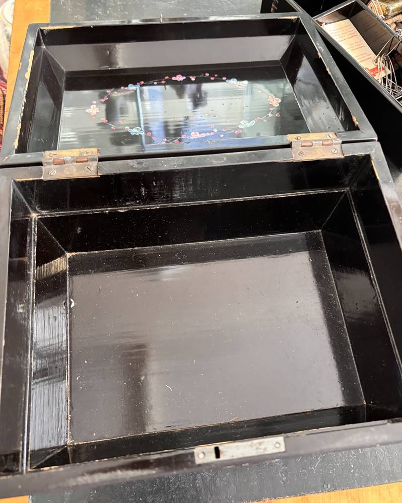 Lack-Nähkasten mit floralen Dekor, oberes Einsatz mit Einteilung, etwas Inhalt, Deckel mit Perlmutteinlagen, Vögel auf Zweigen, H-13 cm, 24x18 cm