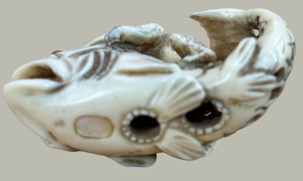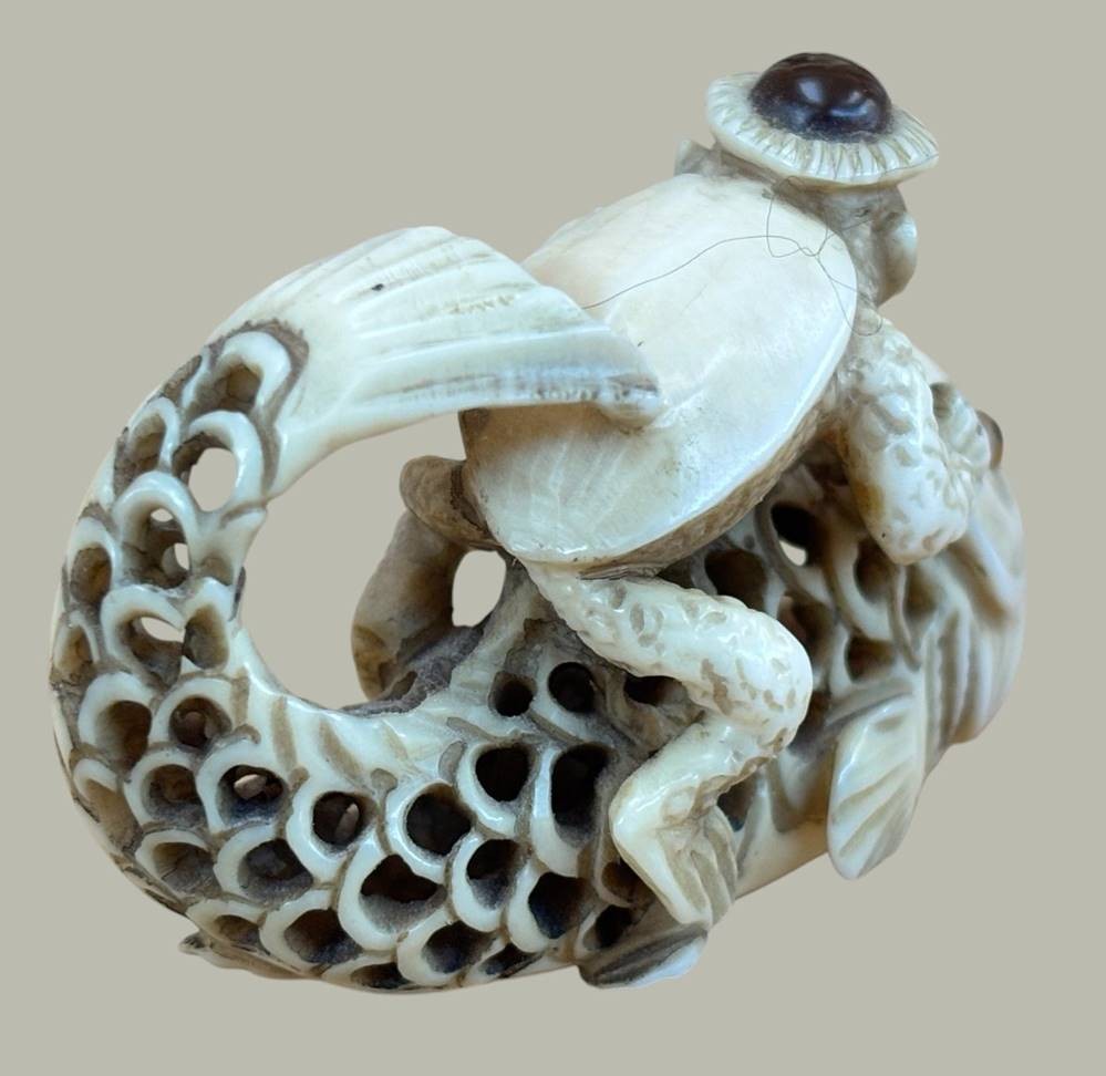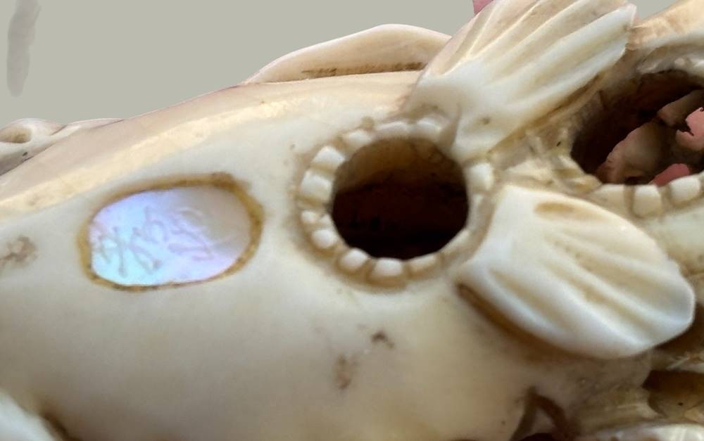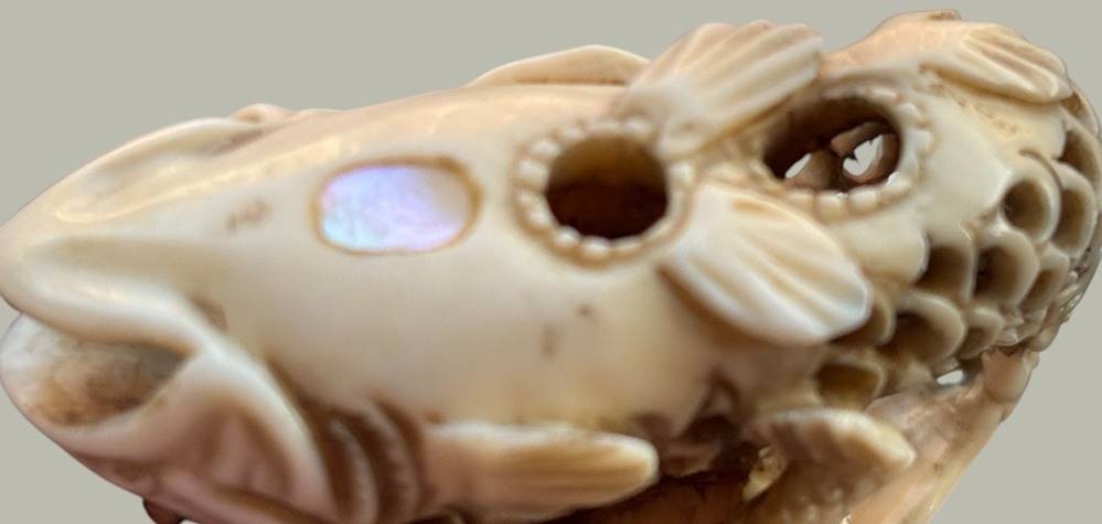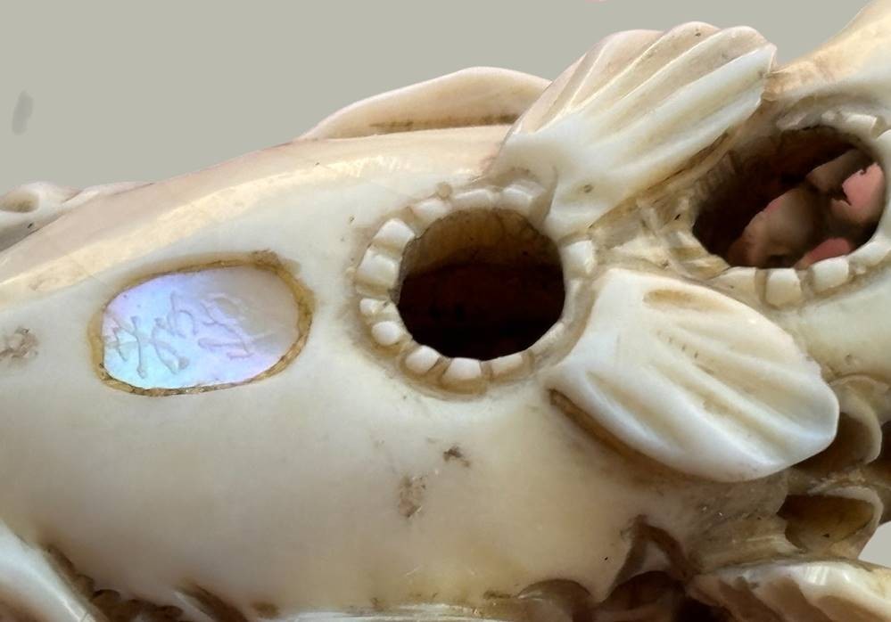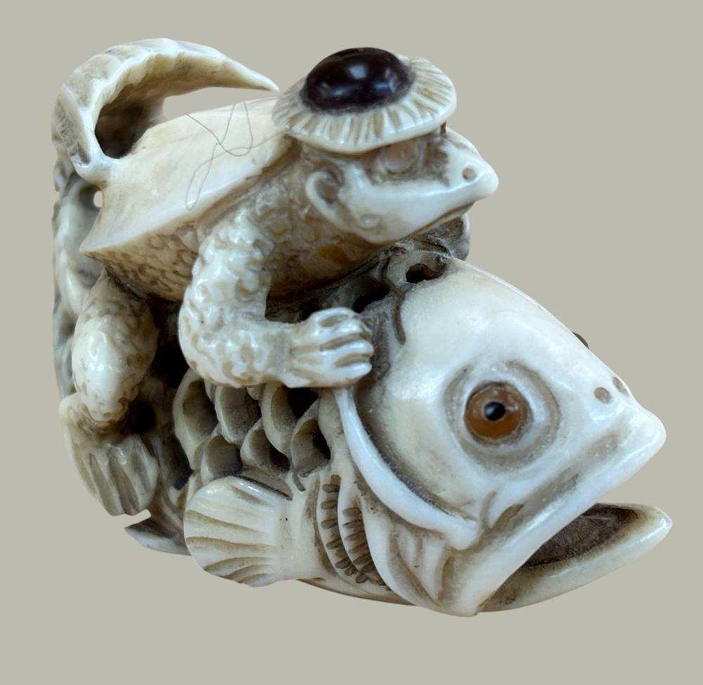 Netsuke, Frosch auf Fisch, Taguanuss, Japan, signiert auf eingelegter Perlmutt-Platte, L-5 cm, H-3 cm [1]