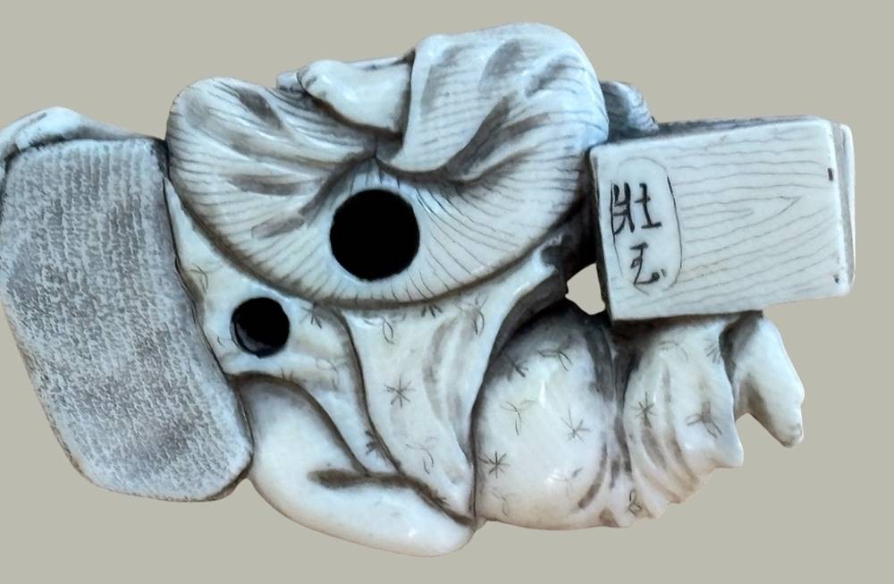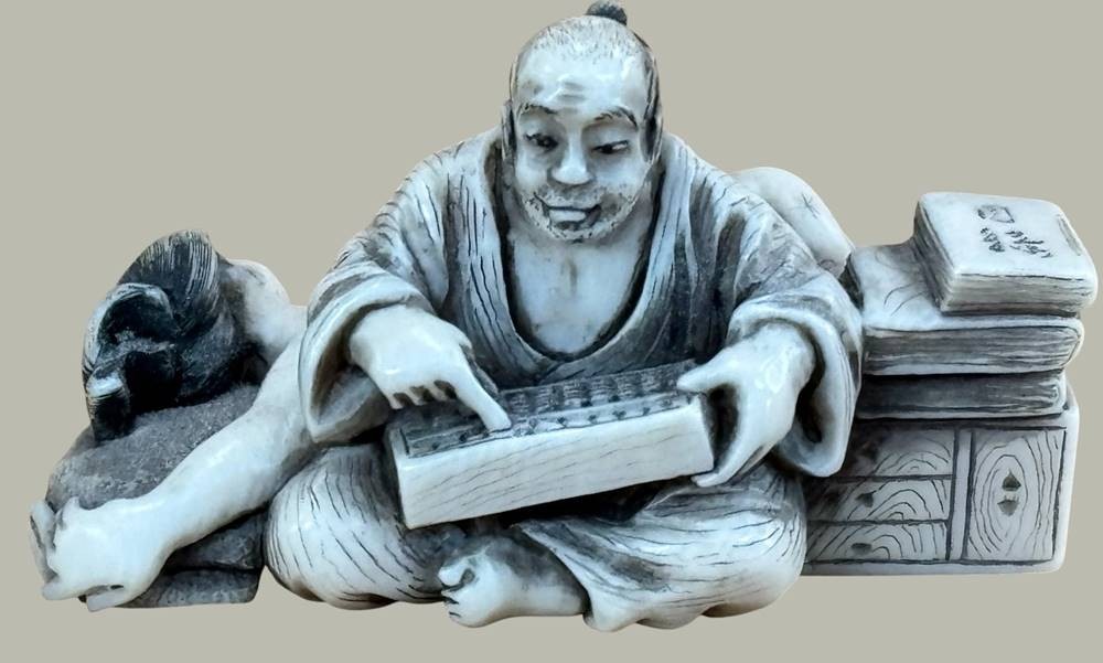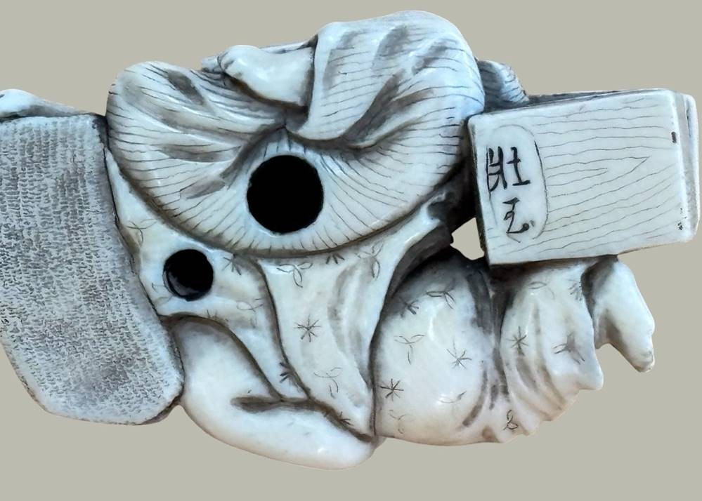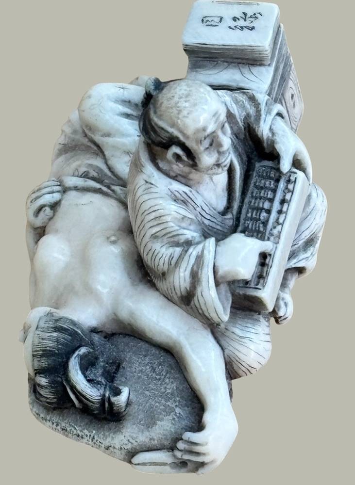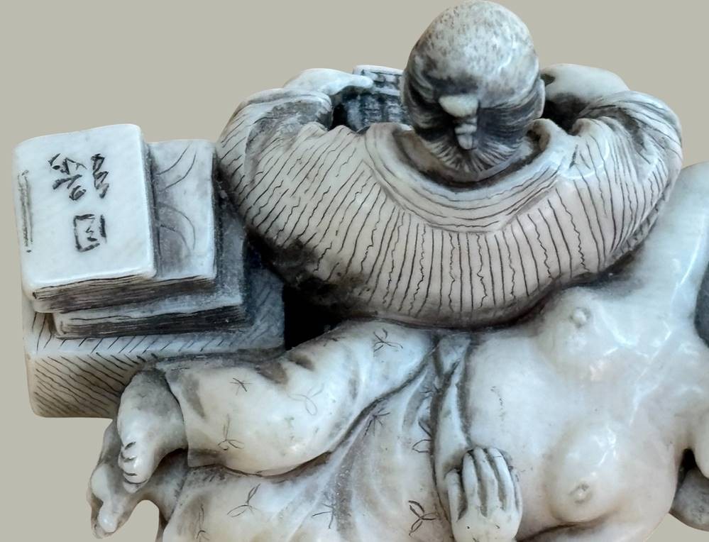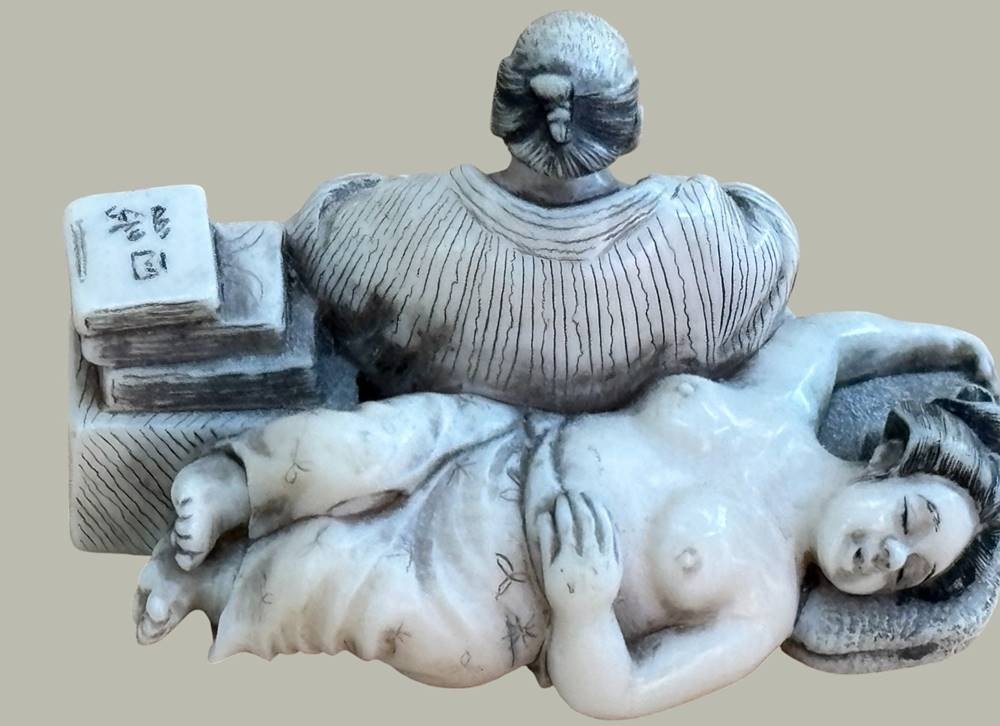 Netsuke "Lesender Mann mit schlafender Frau, Teganuss, signiert, Japan, H-2,7 cm, L-5 cm [1]