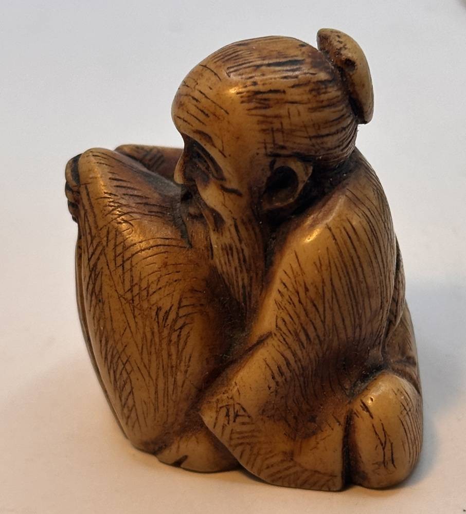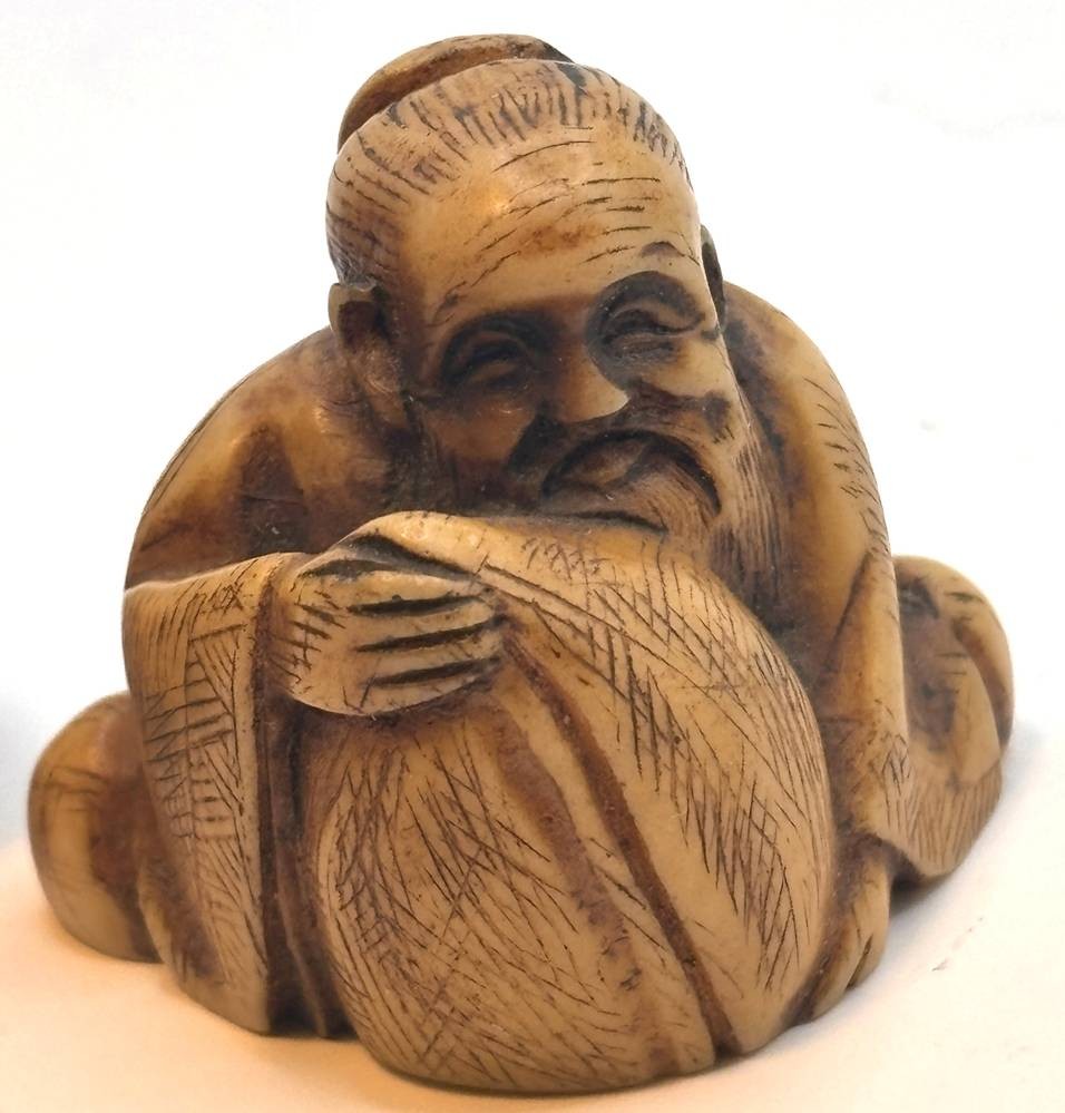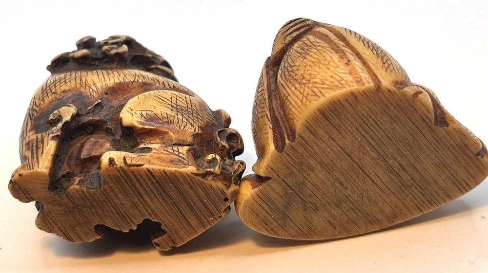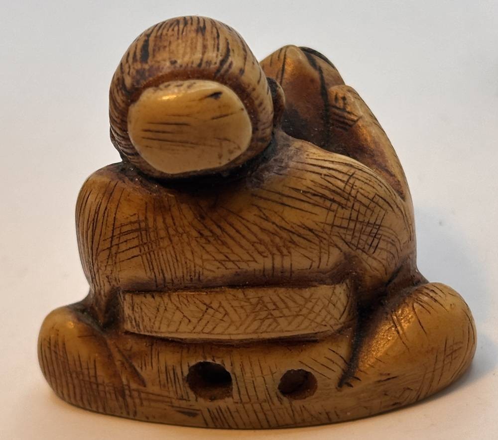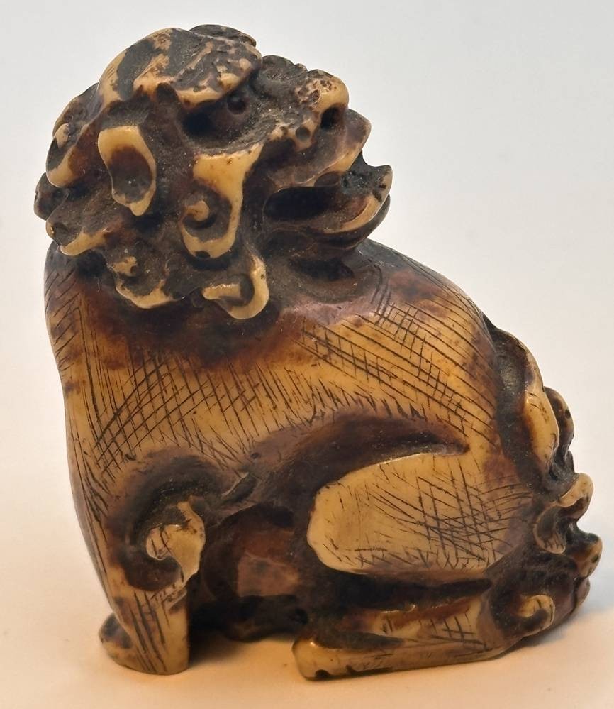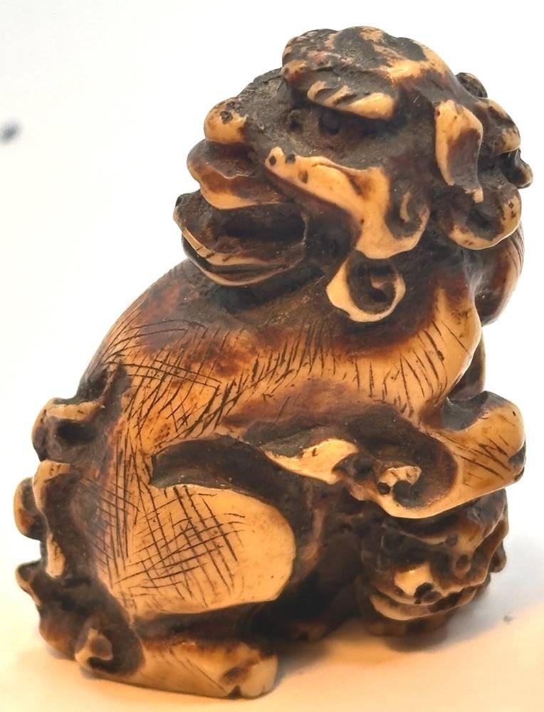 Netsuke und Tempellöwe, wohl Kunstmasse, H-ca.3,5 und 4 cm [1]