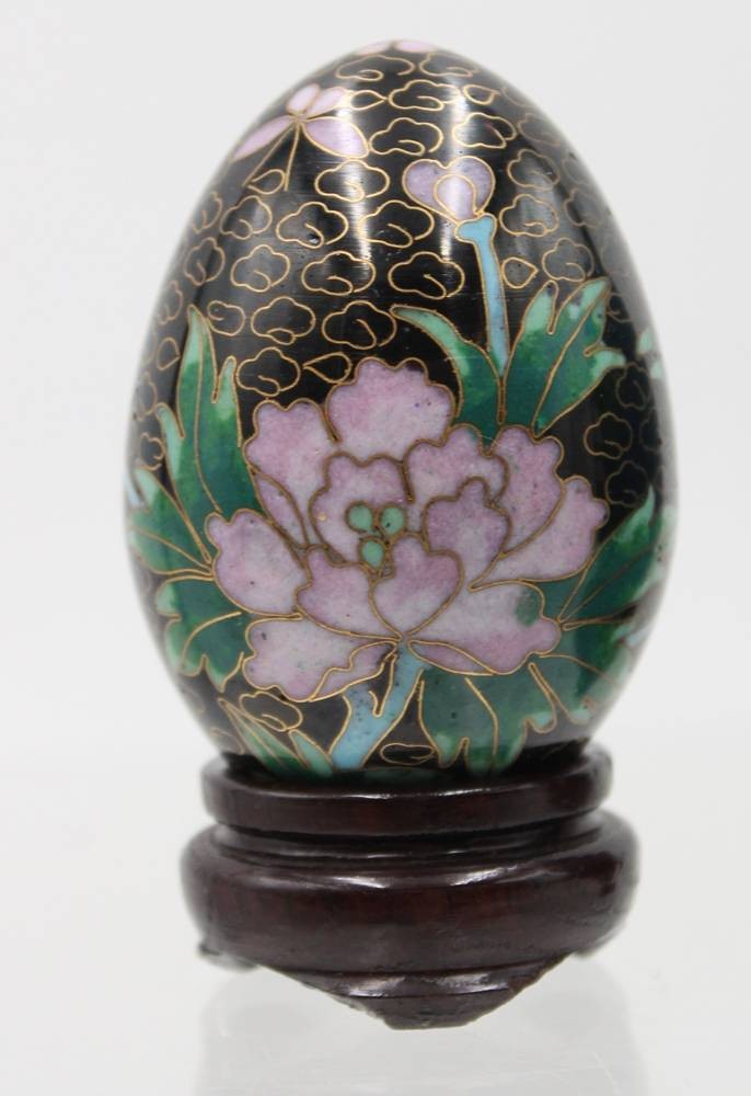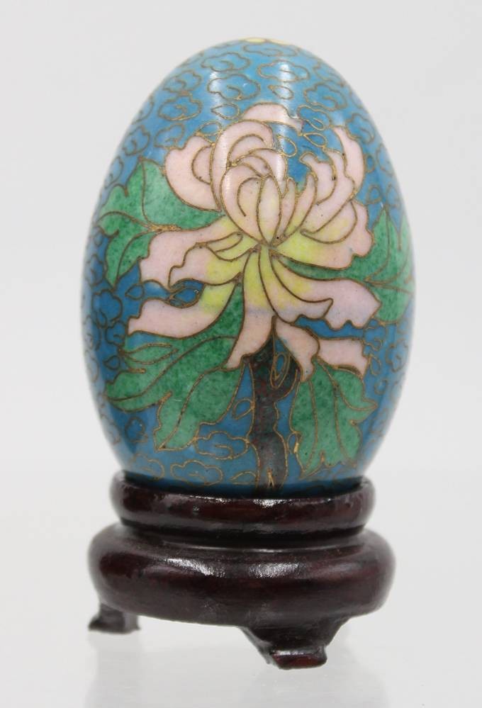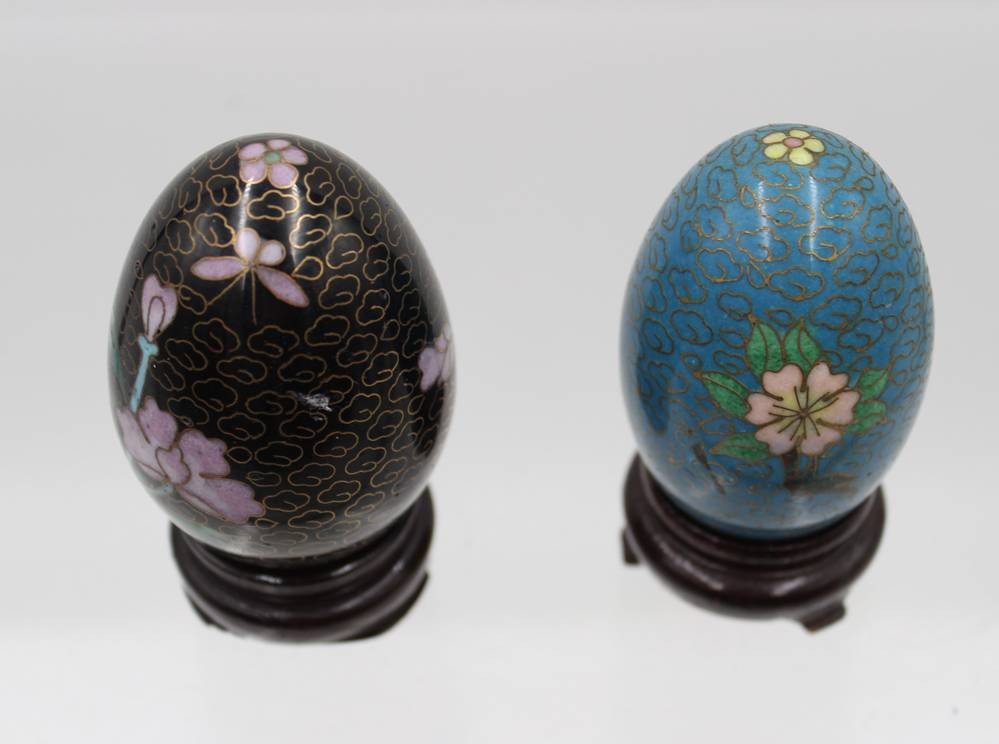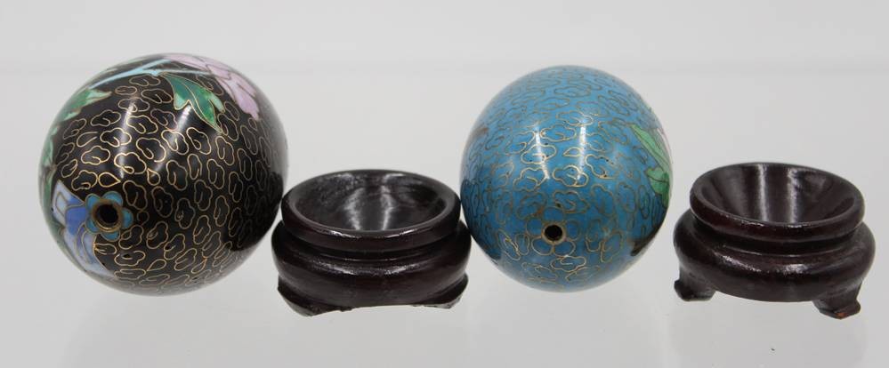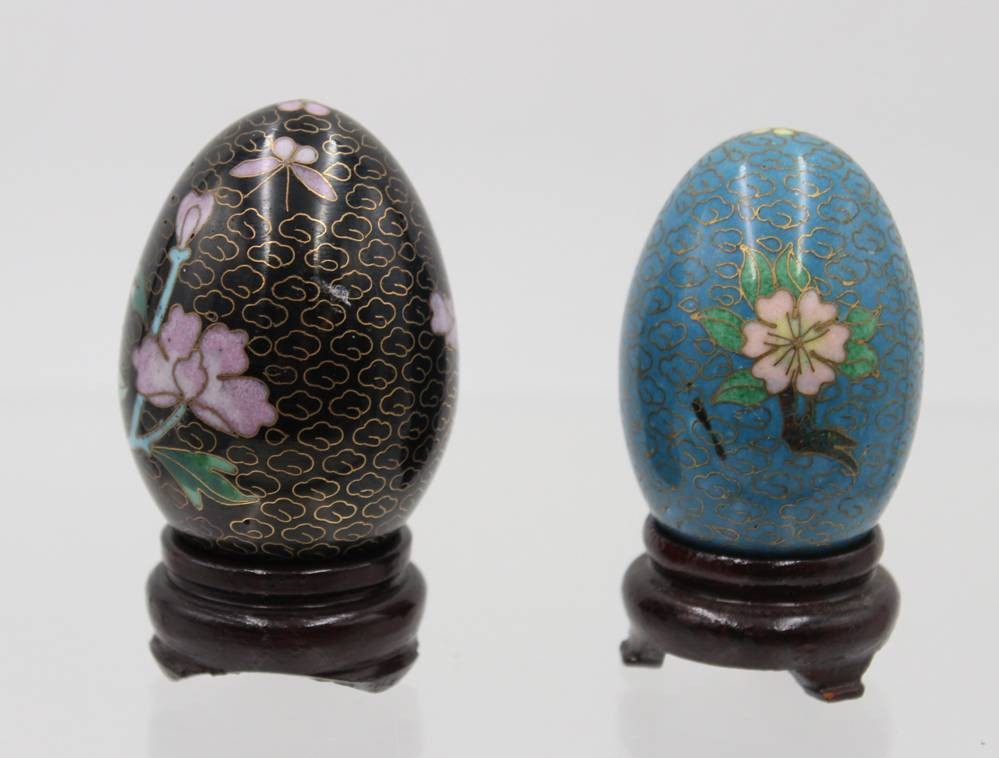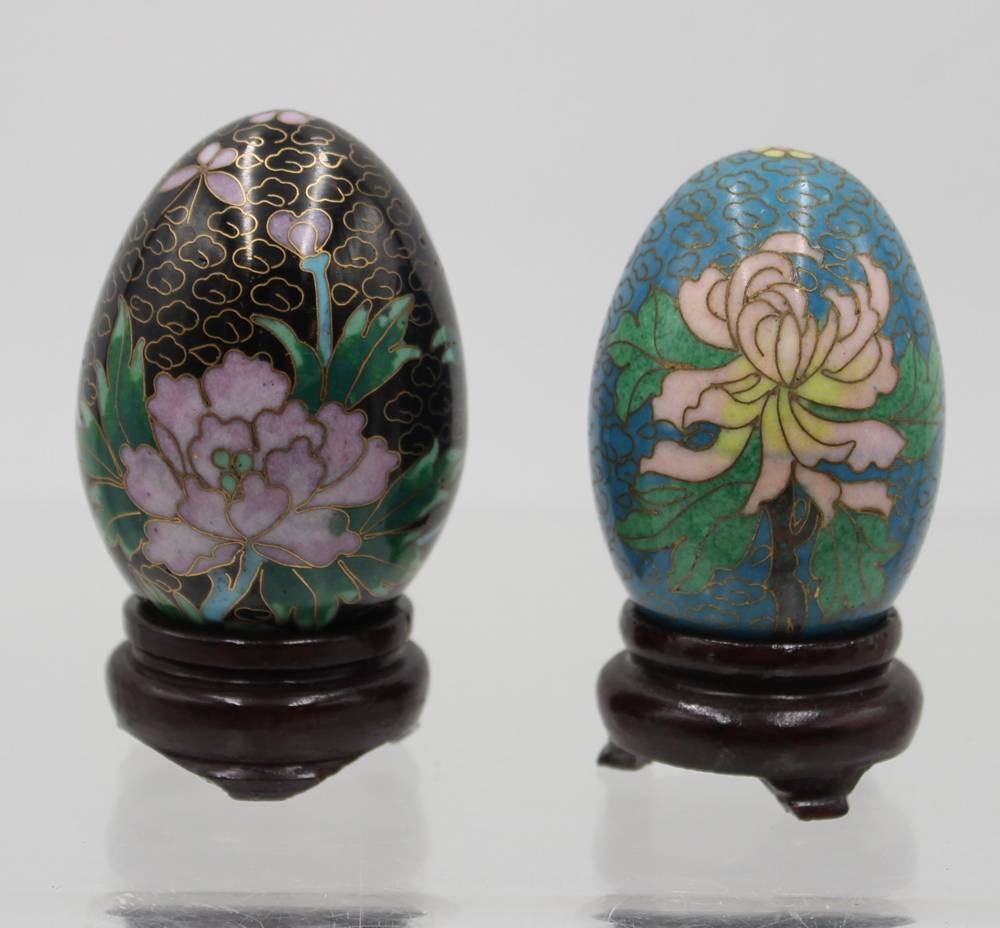 Paar Cloisonné-Eier m. Holzstand, China, ca. H-8cm [1]