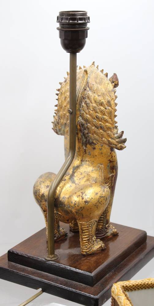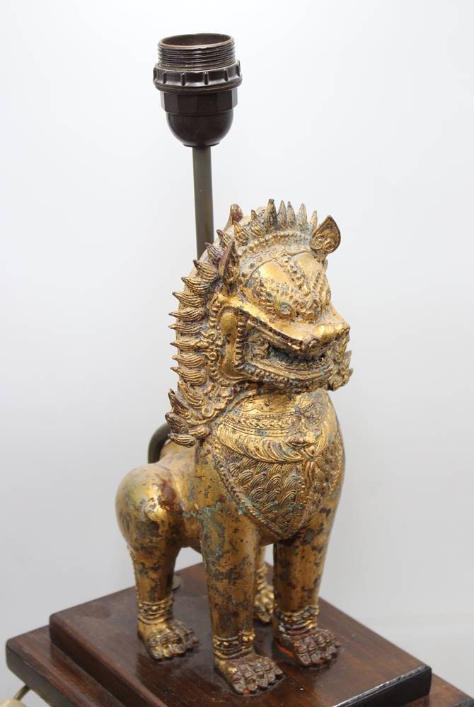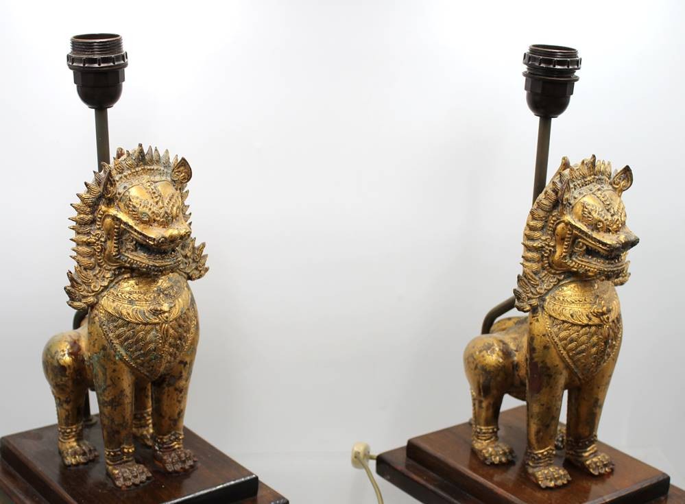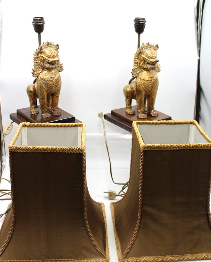 Paar Tischlampen mit Singha-Löwen, Thailand, Holz, je ca. H-67cm [1]