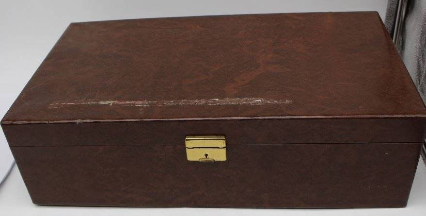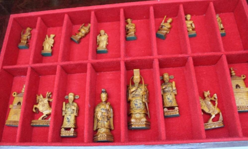 Schachspiel in Holzkasten, 32 Figuren, wohl Beinschnitzerei ?, China, H-5,5 bis 10,5 cm, 2x fehlen Kleinteile