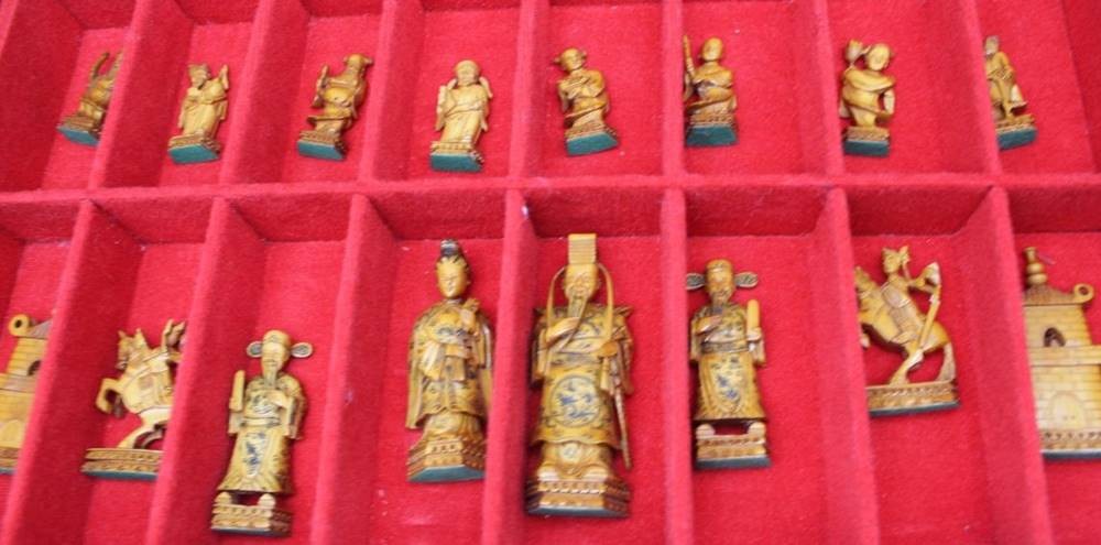 Schachspiel in Holzkasten, 32 Figuren, wohl Beinschnitzerei ?, China, H-5,5 bis 10,5 cm, 2x fehlen Kleinteile [1]