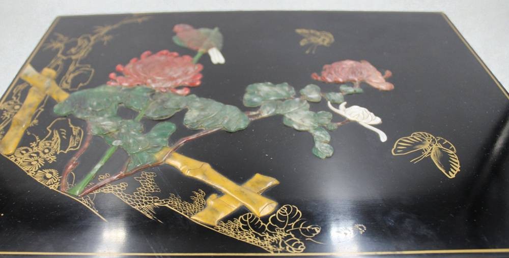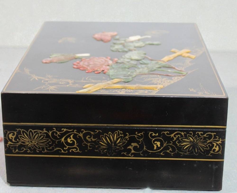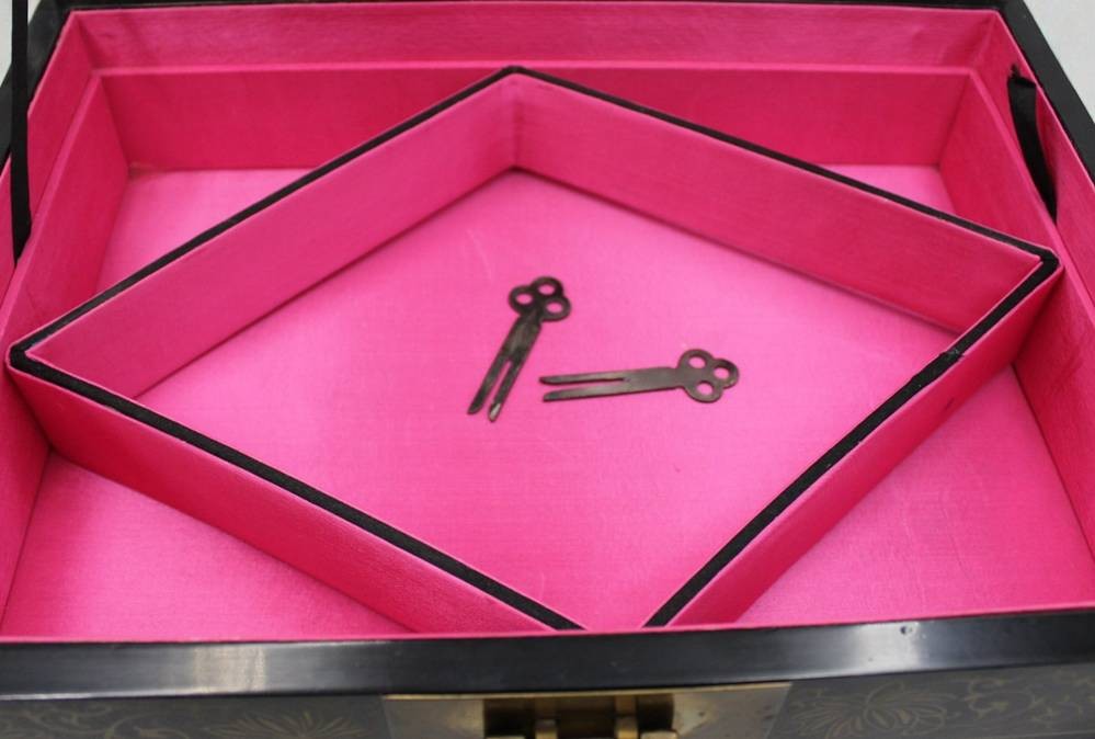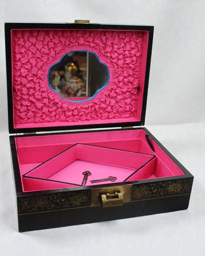 schöner Lack-Schmuckkasten, China, floral garbeitetet Auflagen, innen Stoff und Spiegel, Schloss und 2 Schlüssel anbei, ca. 11,5 x 33 x 24,5cm [1]
