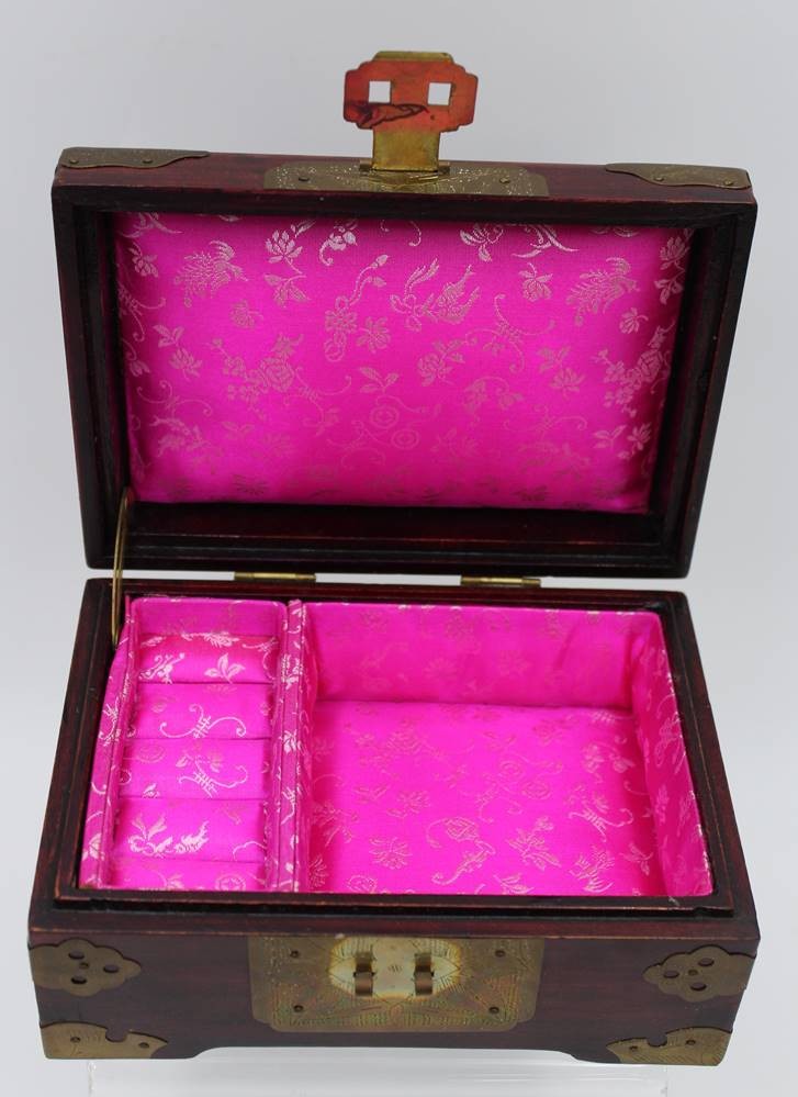 schöner Schmuckkasten, China, Messingbeschläge, Deckel wohl mit Jade-Einlage, guter Zustand, H-8,5cm B-17,5cm T-12cm [1]