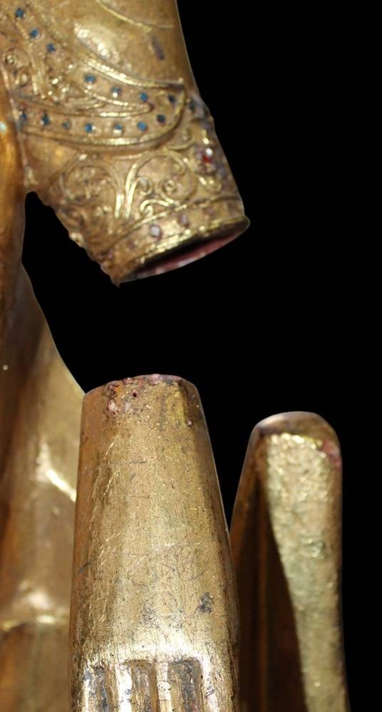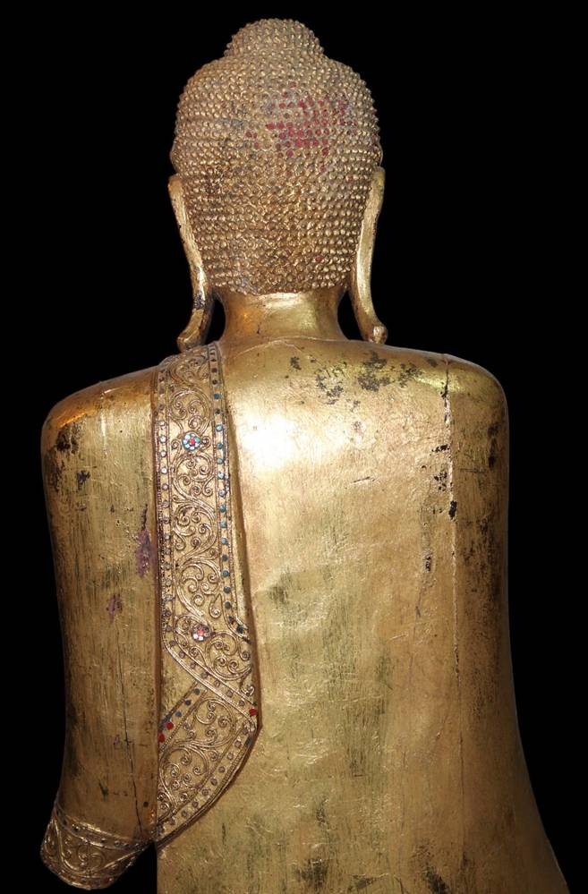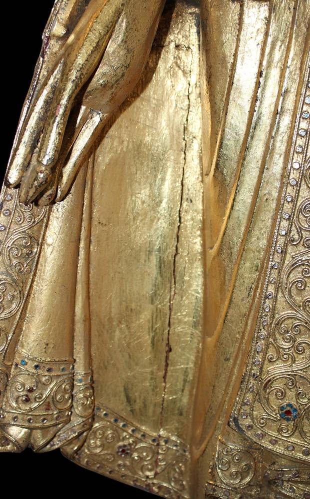 Stehender Mandalay Buddha aus Burma Holz vergoldet und verziert, auf einem Holzsockel stehend, eine Hand lose, ca. H-146cm, Speditionsversand [1]