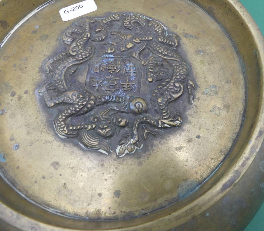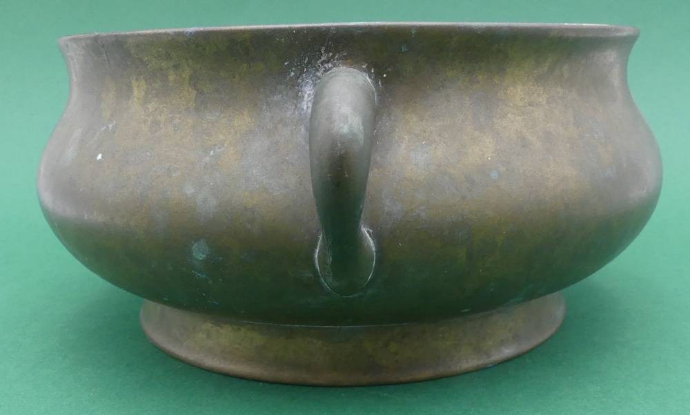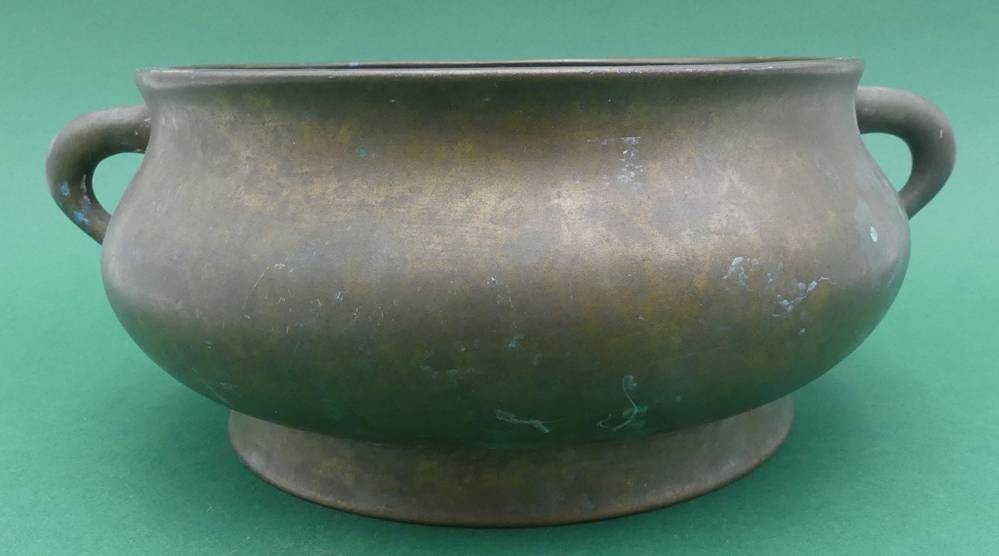 Weihrauchbrenner aus Bronze - China, Qing-Zeit, runde Form , seitliche Schlaufenhenkel, Bronze, apokryphe Sechszeichen-Xuande-Marke auf Boden, Breite mit Henkel ca. 20 cm, H.ca. 7,5 cm, Gewicht ca. 964gr. [1]