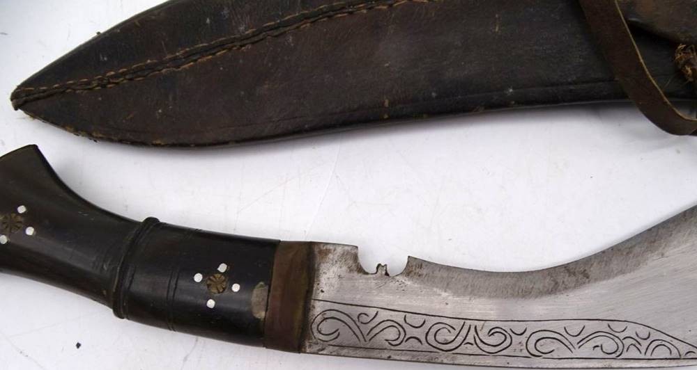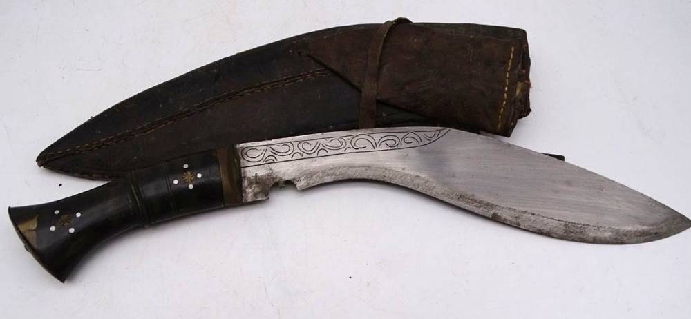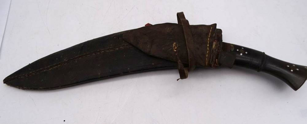 wohl indischer Krummdolch in Lederscheide, kl. Messer anbei, ungepflegt [1]