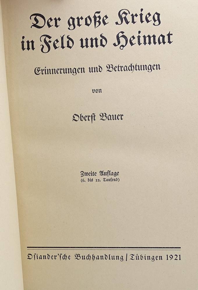 Der große Krieg in Feld und Heimat, Erinnerungen und Betrachtungen von Oberst Bauer, Zweite Auflage, 1921 [1]