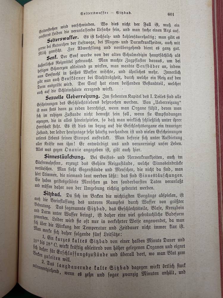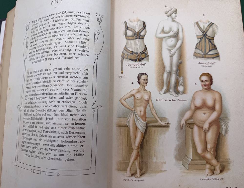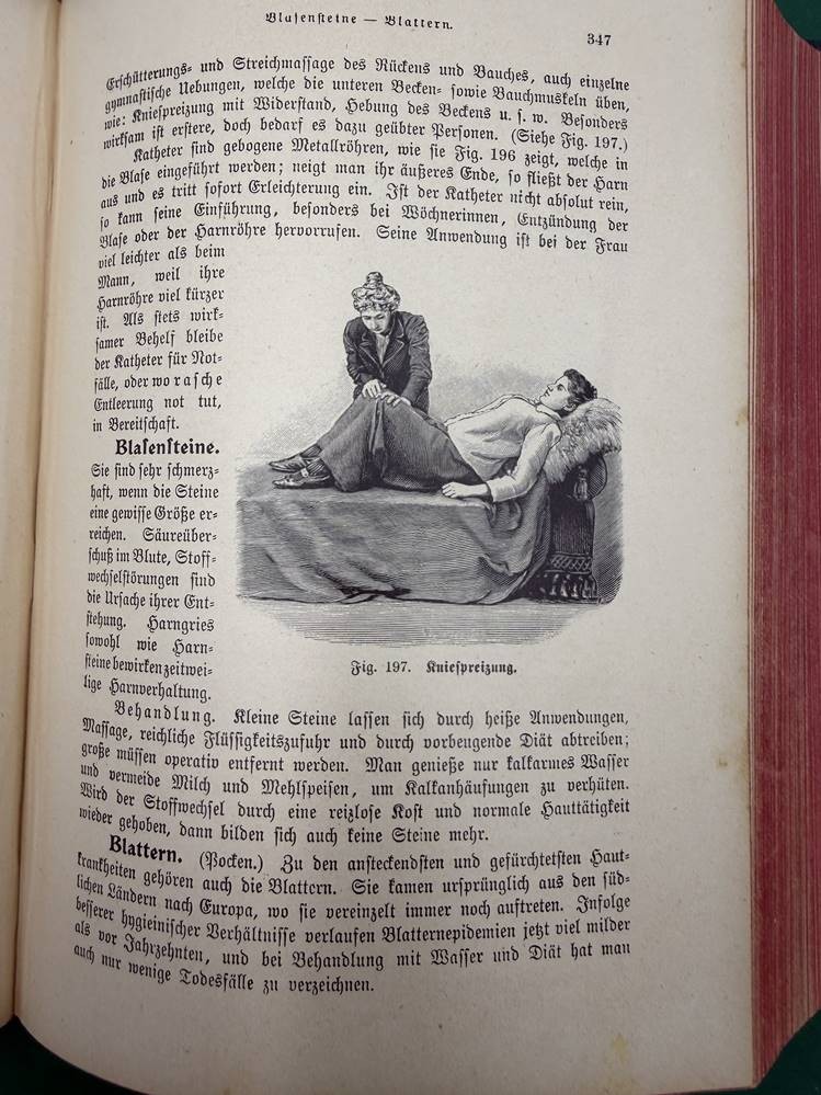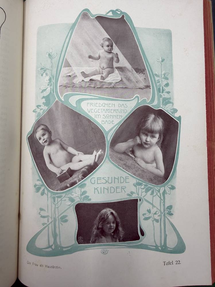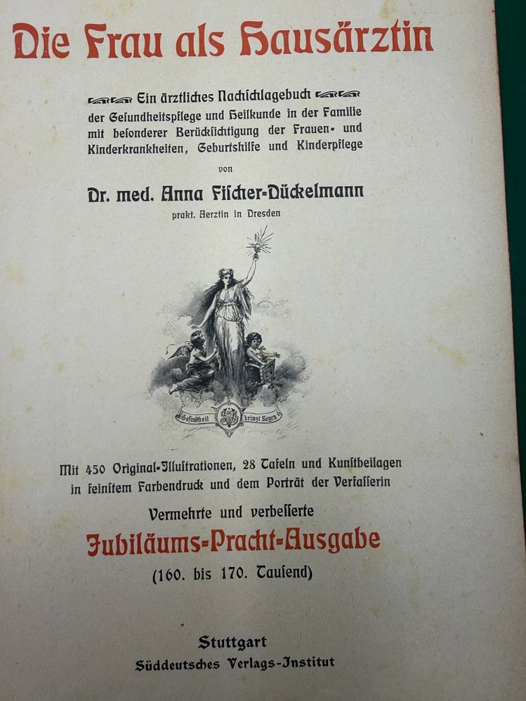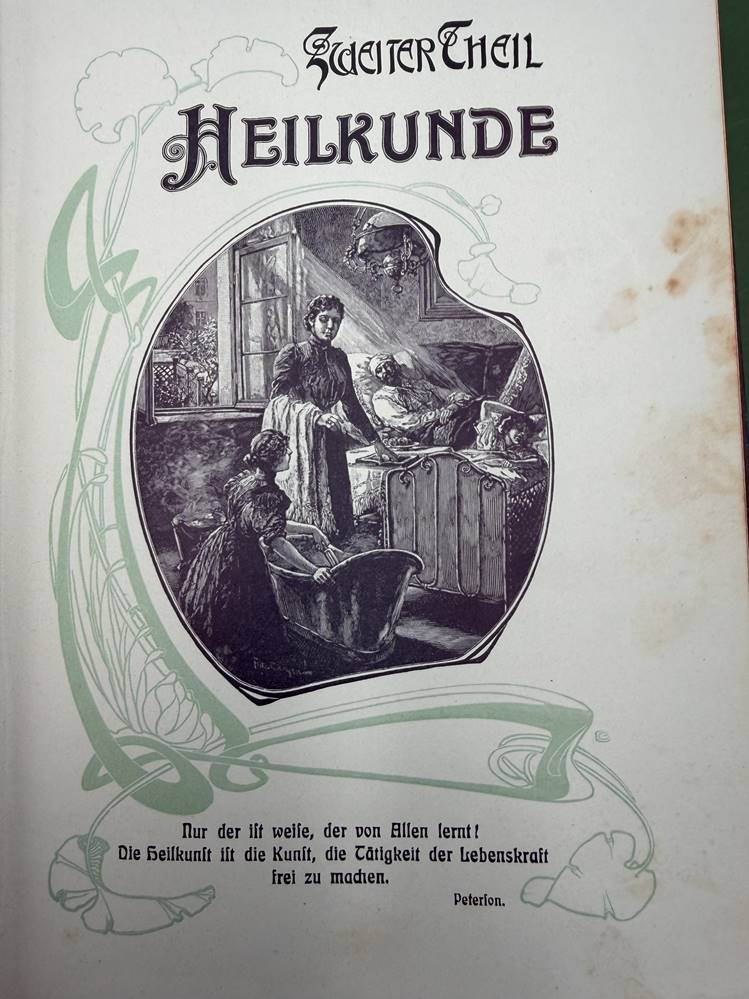 "Die Frau als Hausärztin" um 1900, Jugendstil-Einband mit Gebrauchsspuren, Seiten etwas fleckig, ansonsten gut erhalten [1]