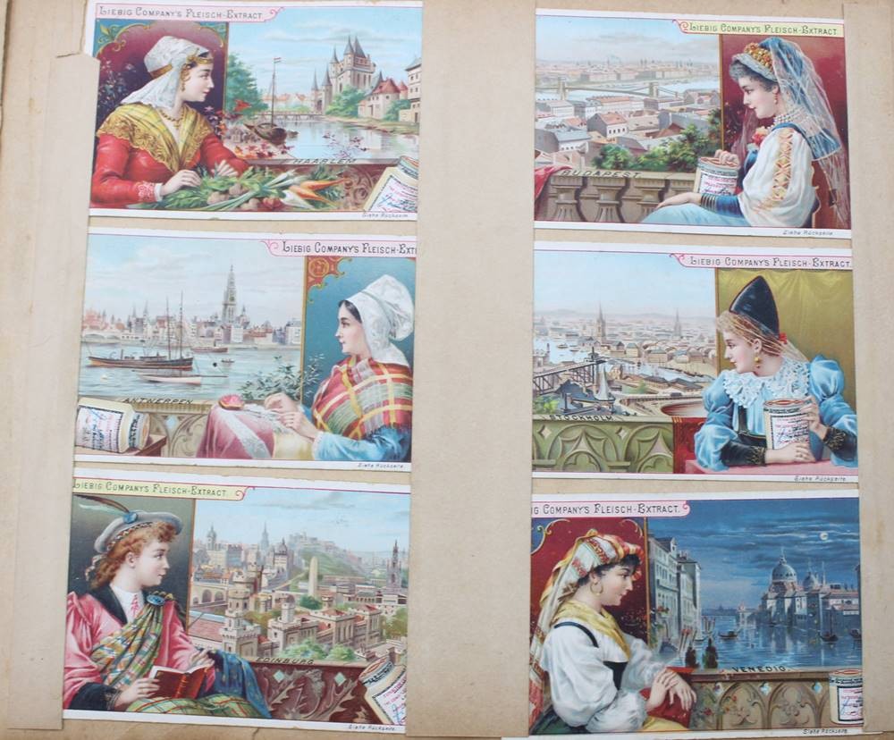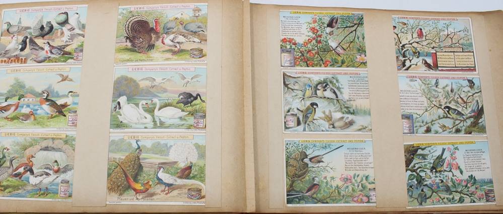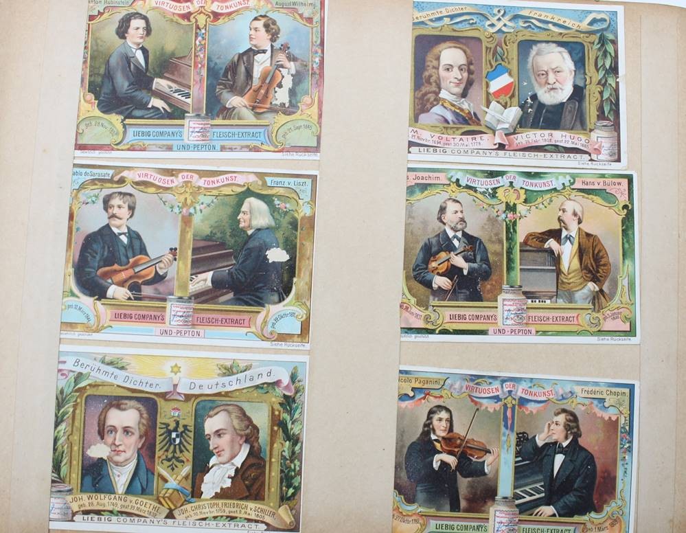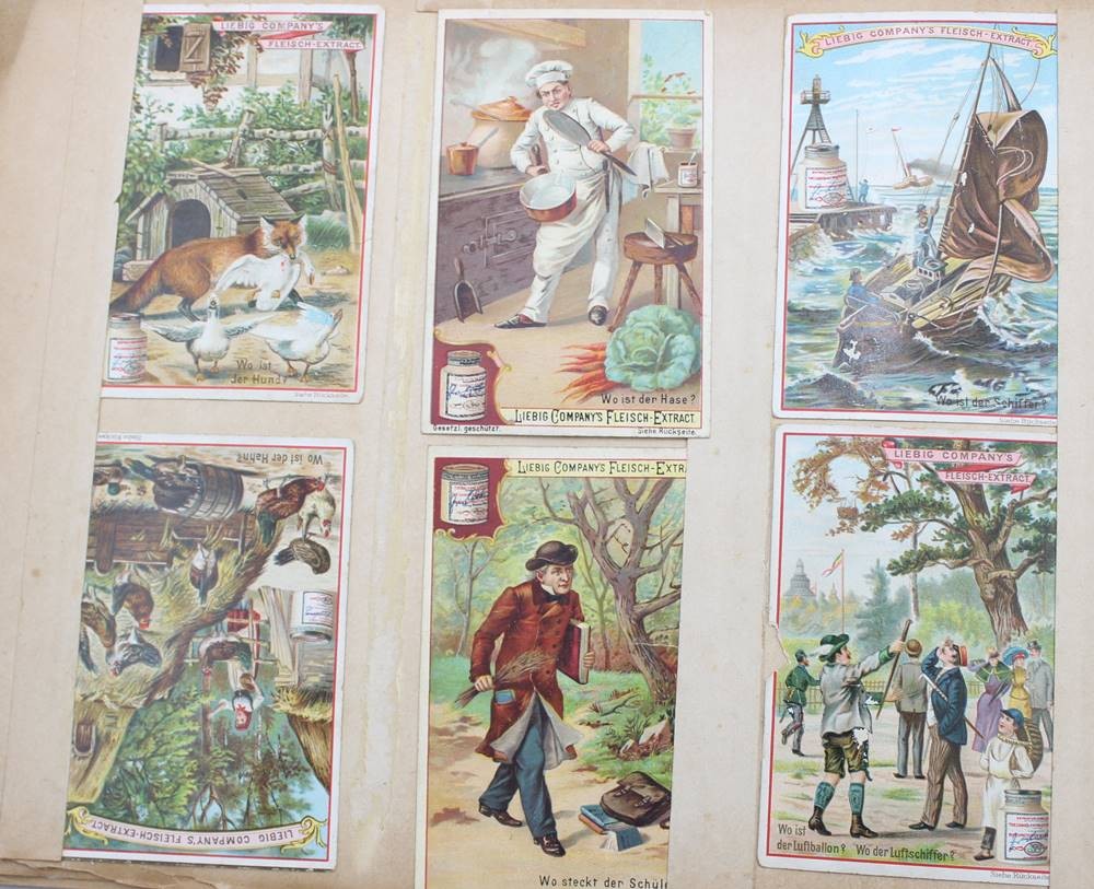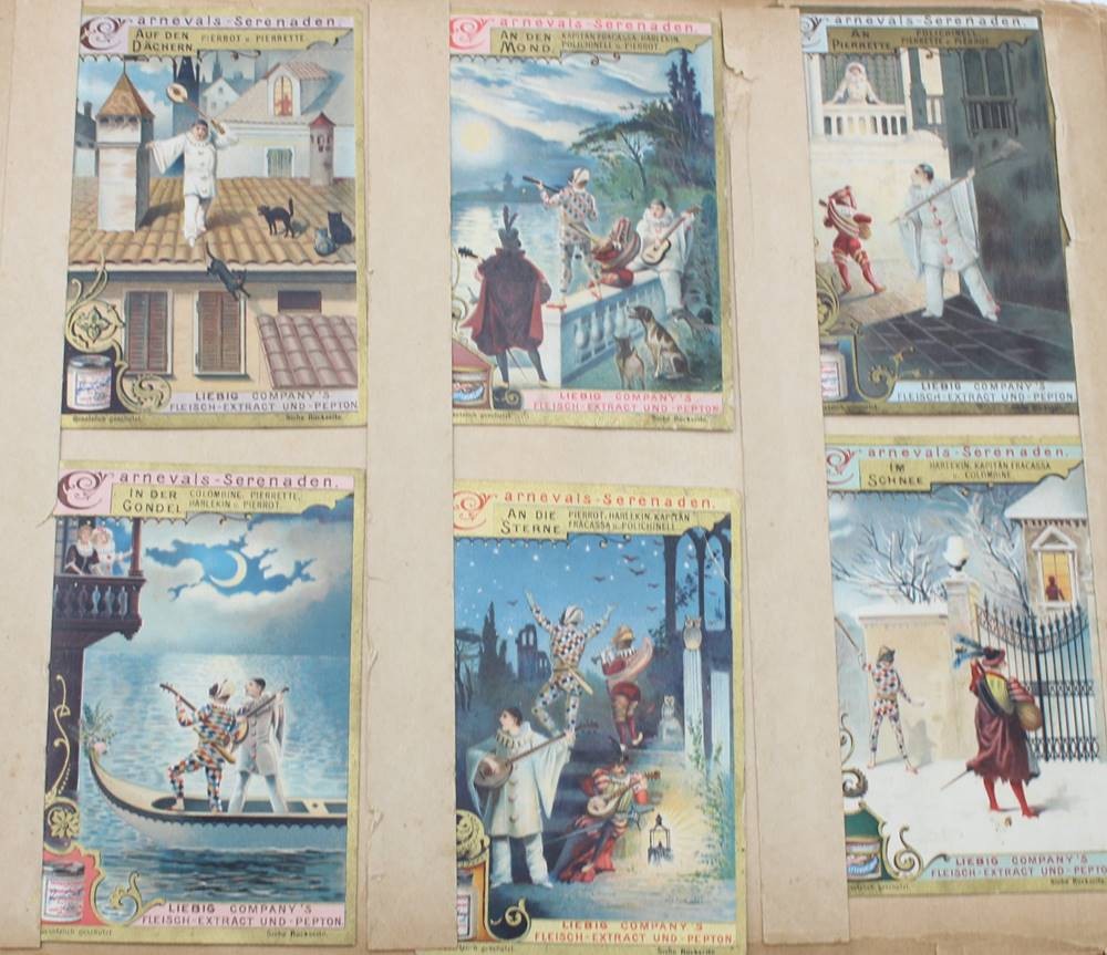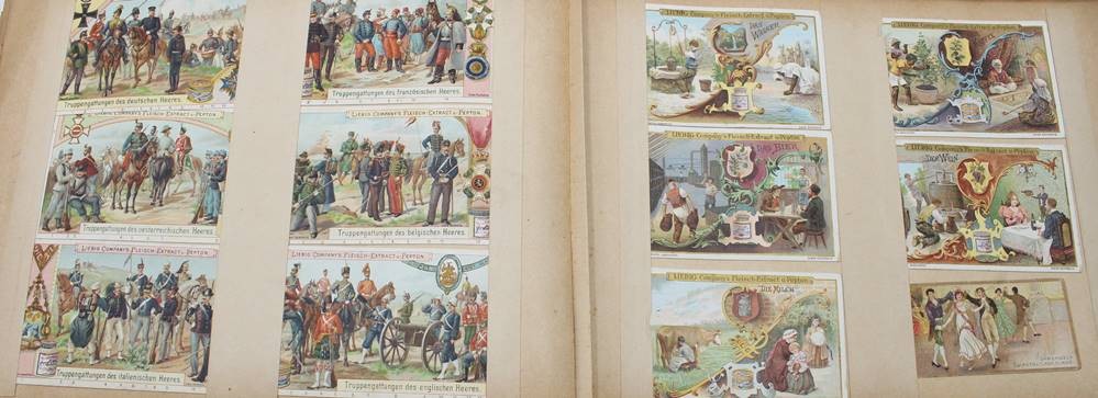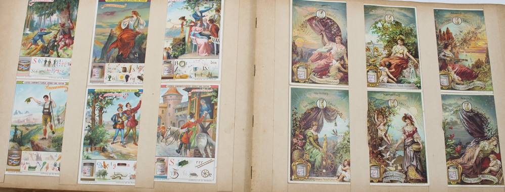 gr. Liebig-Sammelalbum, 19. Jhd., viele Serien, u.a. Carnevals Serenaden, Weihnachten, div. Märchen, Cuba, Feste und Umzüge, Lederstrumpf etc. Album mit Alters-u. Gebrauchsspuren, Bilder intakt