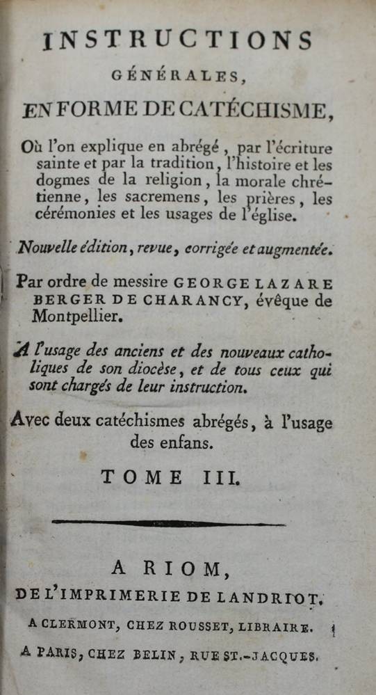 Instructions générales en forme de catechisme: ou l'on explique en abrégé par l'Ecriture sainte et par la tradition, l'histoire et les dogmes de la religion, la morale chrétienne, les sacremens, les prières, les cérémonies et les usages de l'Eglise. Tome III, um 1800 [1]