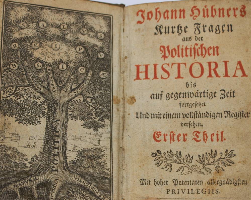 Johann Hübner,Kurze Fragen aus der politischen Historia bis zum Ausgange des siebenzehenden Seculi continuiret und mit einer nützlichen Einleitung vor die Anfänger auch vollständigem Register vermehret. 1. Theil, 1749, starke Altersspuren