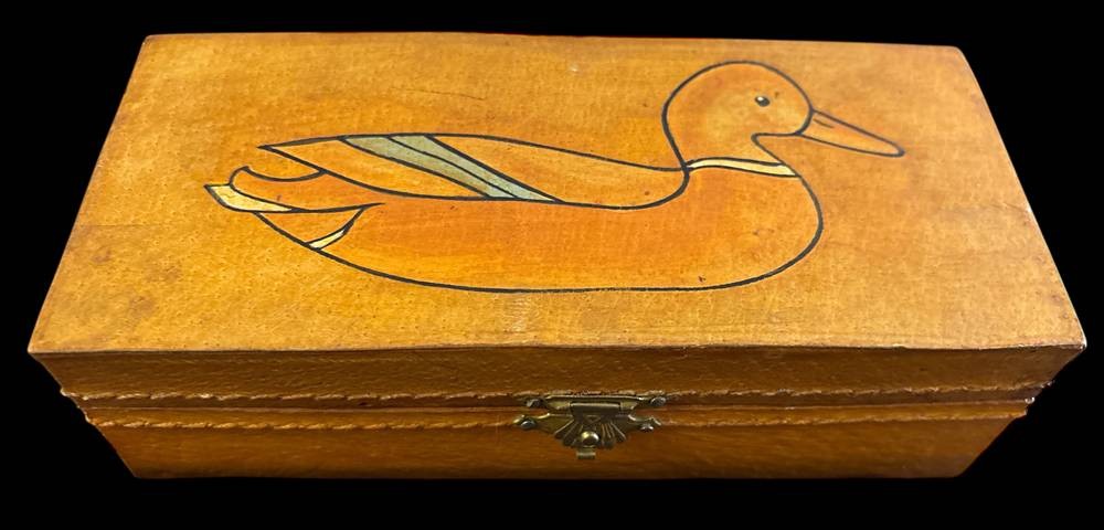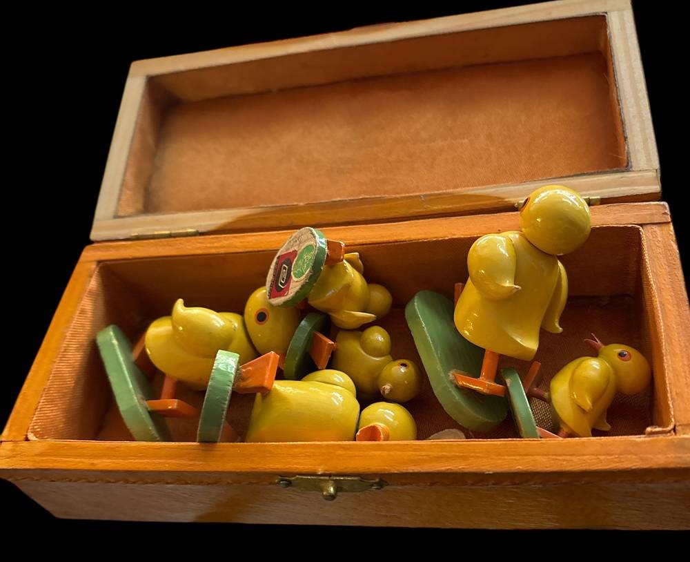 6x div. Erzgebirge Enten "Wendt u. Kühn" 2 Grössen, 2 und 4 cm, in Holzkästchen mit Ente auf Deckel,