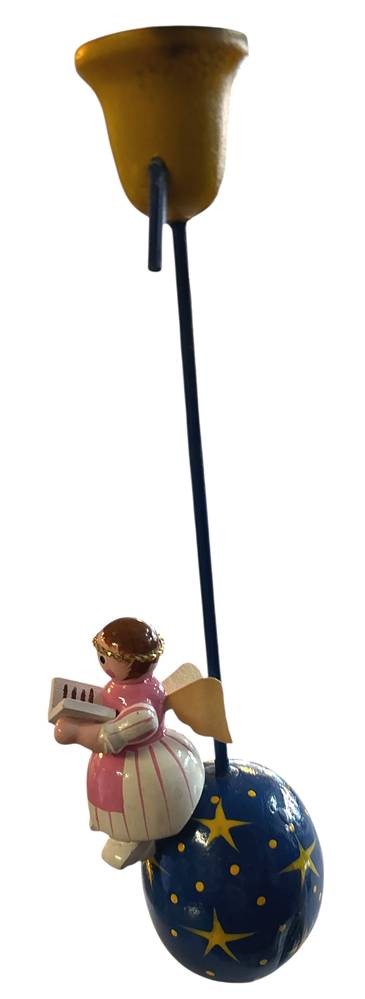 Erzgebirge Kerzenständer mit Weihnachtsengel auf Kugel, bemalt mit Sternen, H-18 cm