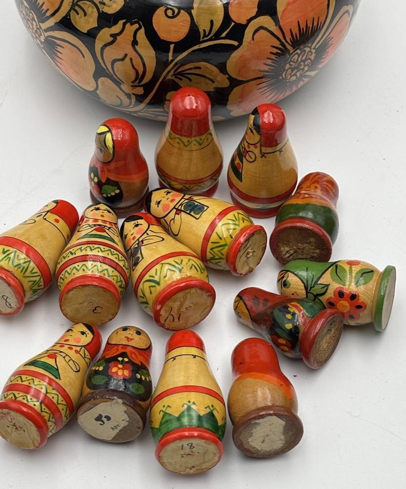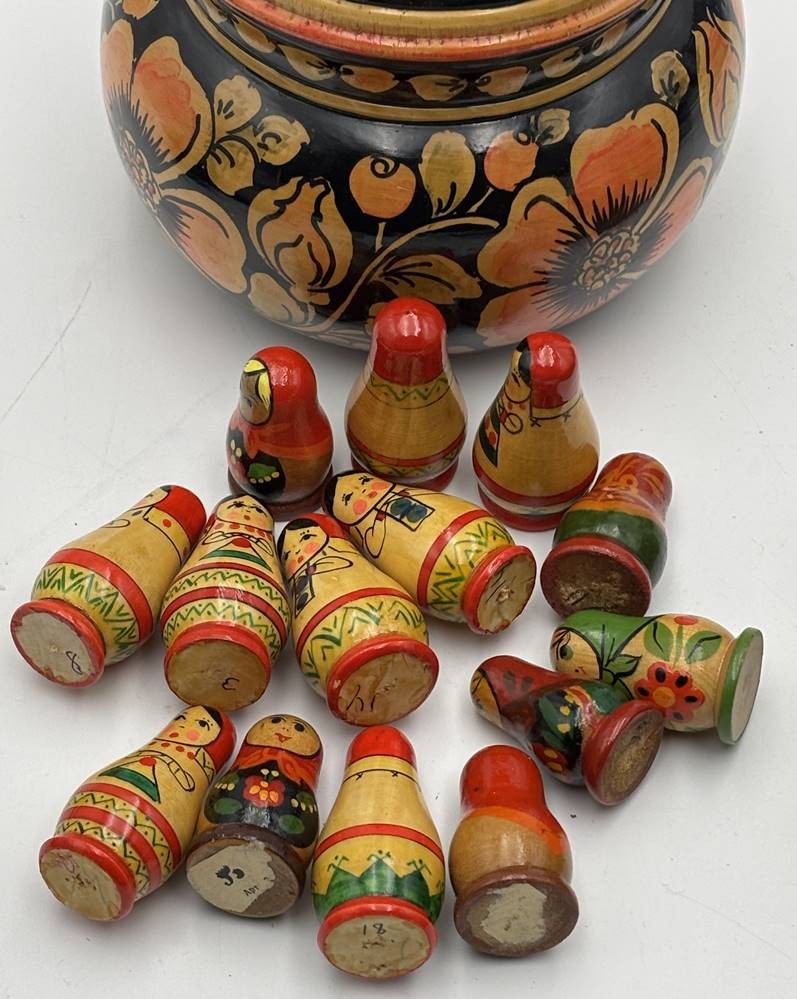 gr. russische Lackdose mit 14 kl. Holzpüppchen, russ. Handarbeit, Dose H-15 cm, D-ca. 17 cm, Puppen H-ca. 6 cm [1]