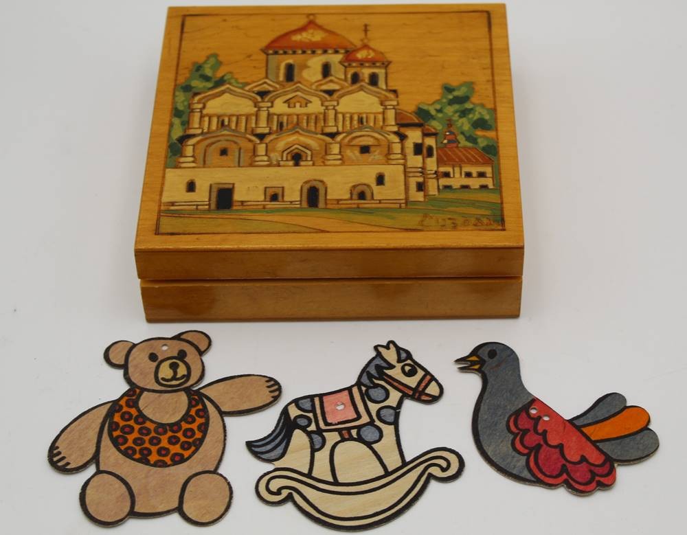 Holzkasten mit beschnitzten Deckel, orthodoxe Kirche, innen 3 Tiere, 3,5 cm, 13x13 cm [1]