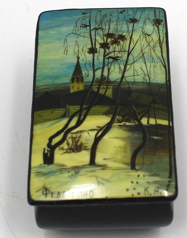 kl. handbemalte russische Lackdose, H-3,5 cm, L-6 cm, signiert [1]