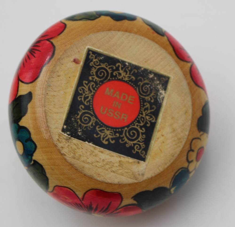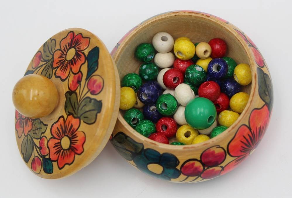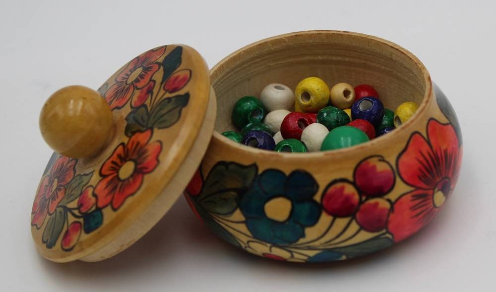 kl. russische Dose mit Blumenbemalung, gefüllt mit kl. Holzperlchen, H-5,5 cm, D-7 cm [1]
