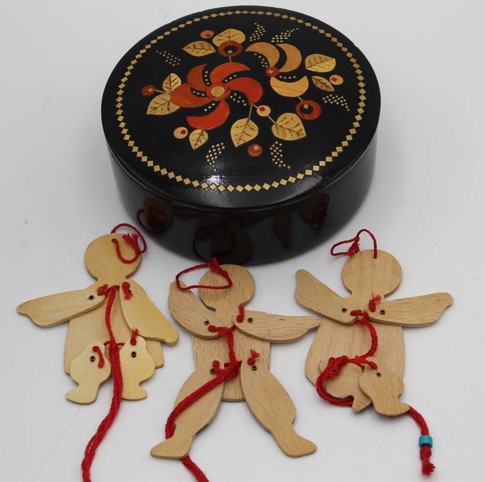 russische Lackdose mit Blumenbemalung und drei Hampelmännern, Dose H-5 cm, D-13 cm, Marionwtten H-9 cm [1]