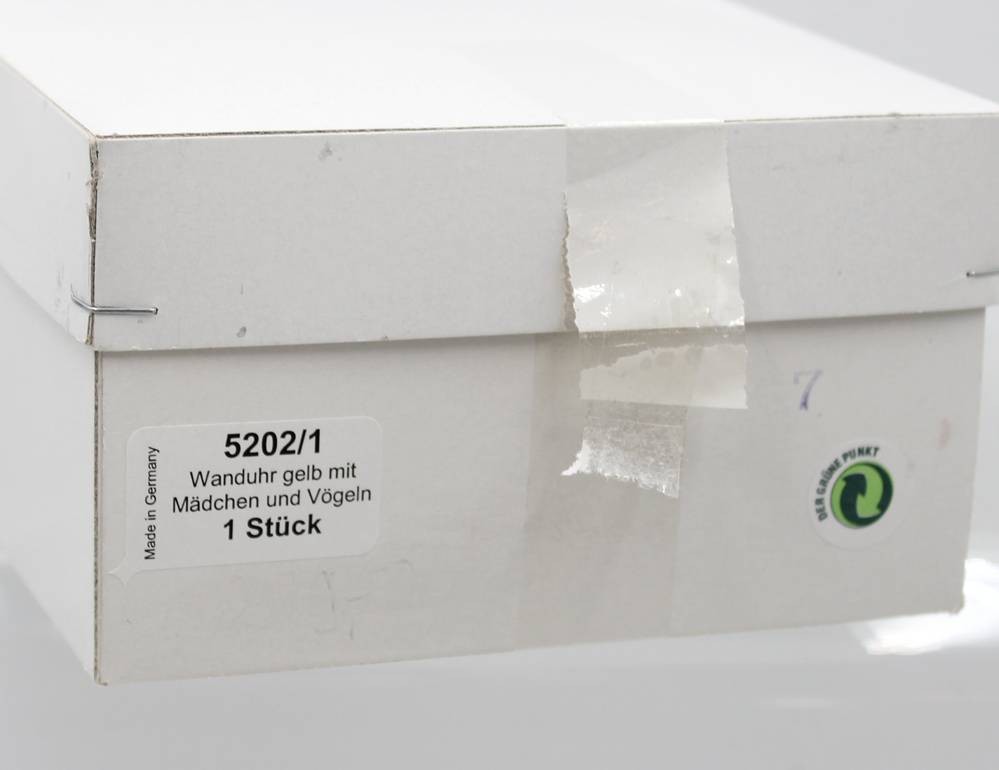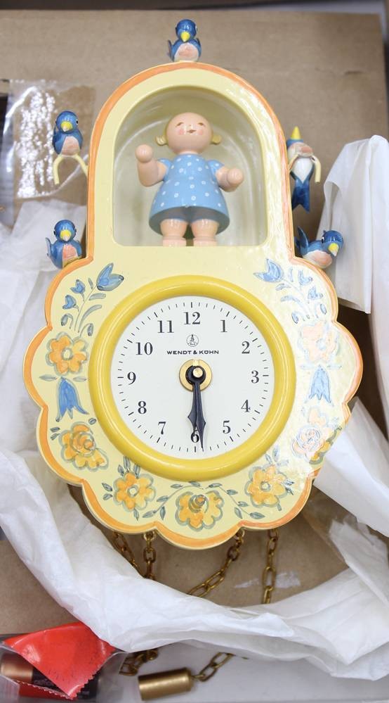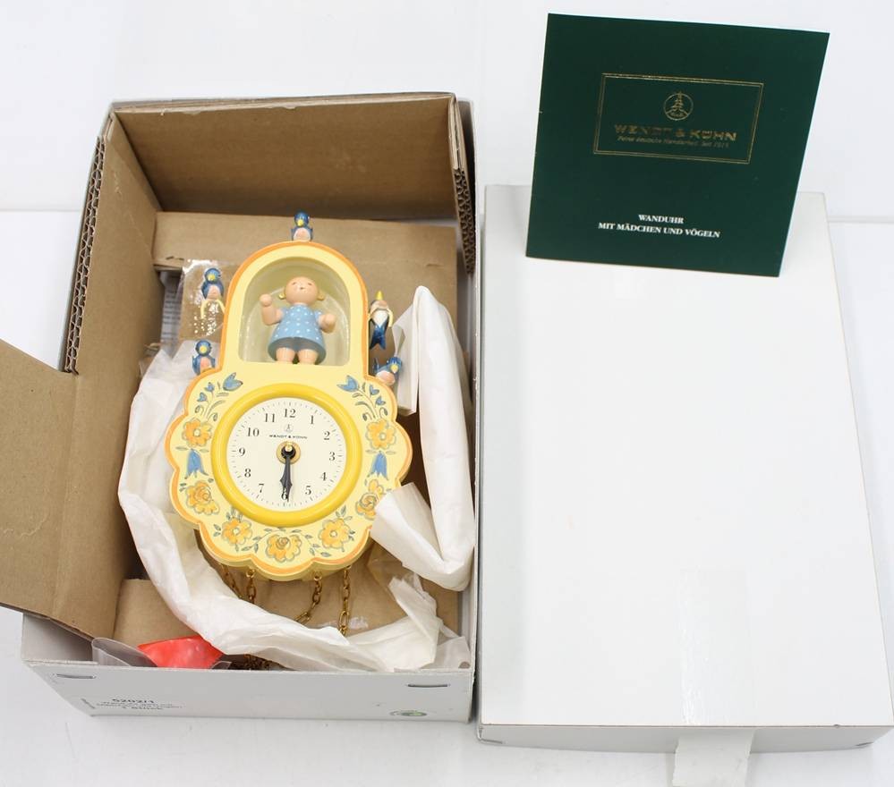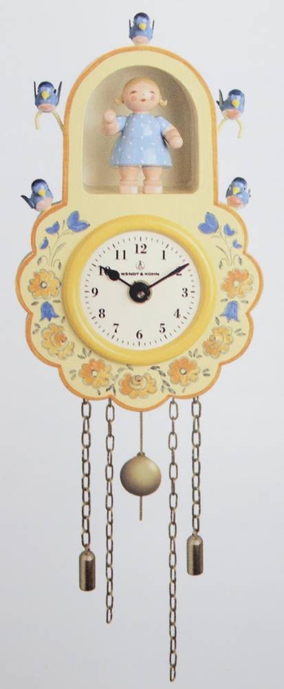 Wanduhr gelb mit Mädchen und Vogel, Wendt & Kühn, Erzgebirge, in orig. Karton, ca. H-14cm [1]