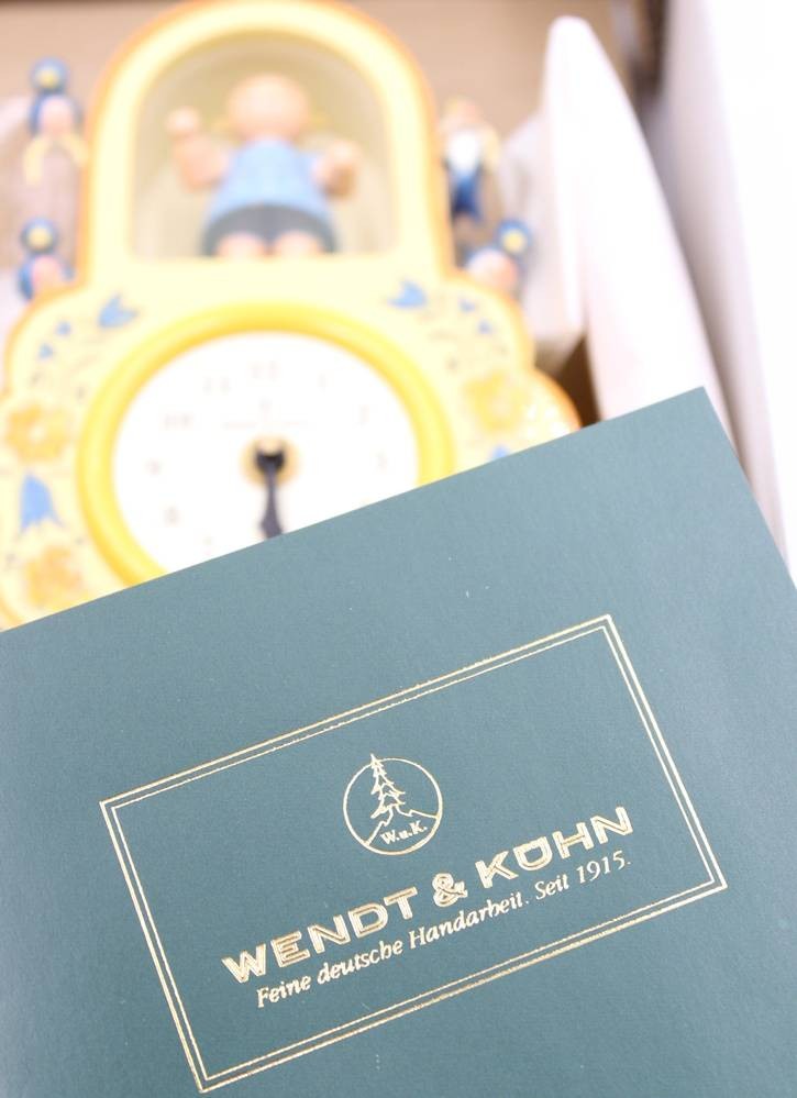 Wanduhr gelb mit Mädchen und Vogel, Wendt & Kühn, Erzgebirge, in orig. Karton, ca. H-14cm