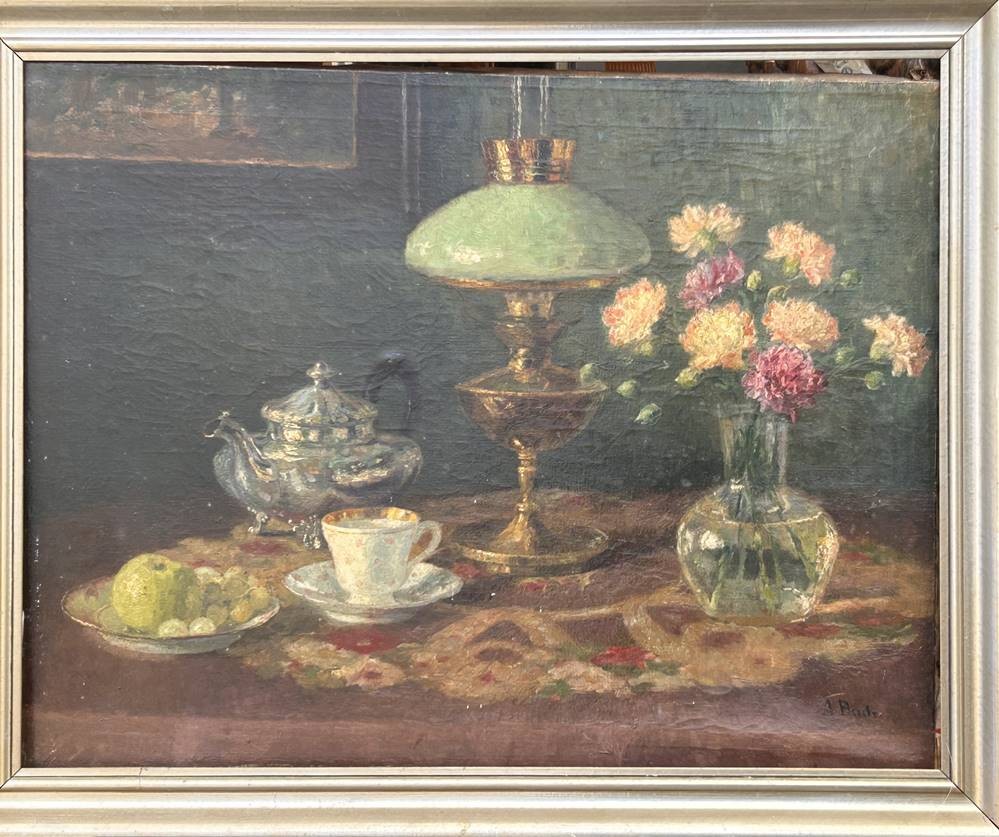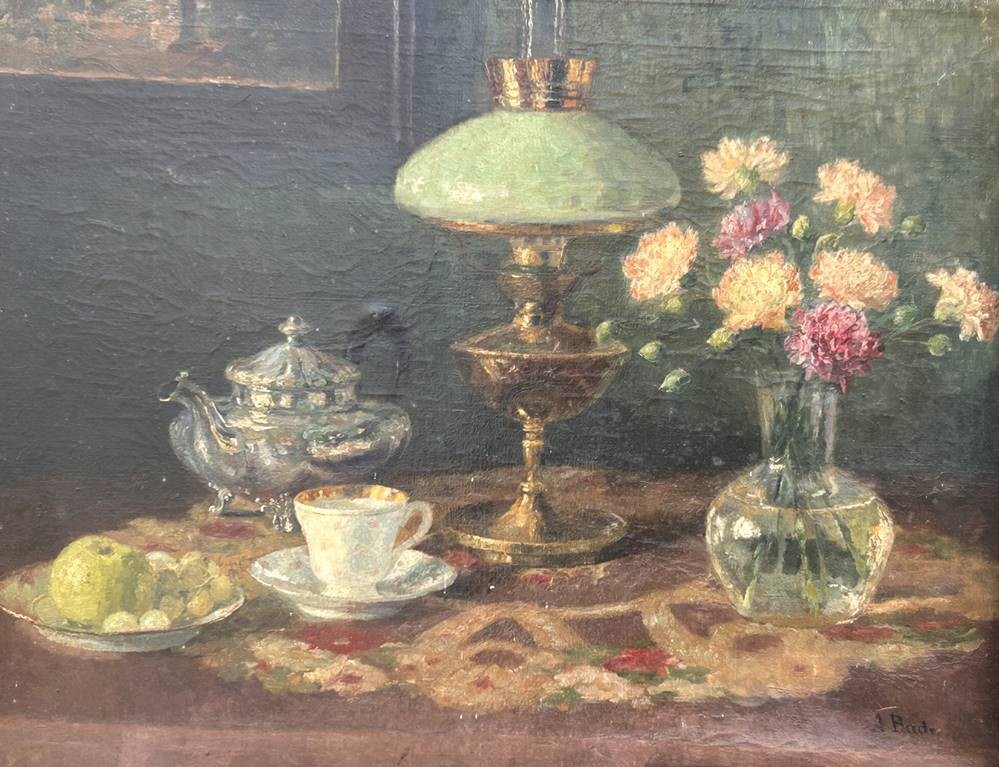 A. BADE (XIX) "Stilleben mit Silber Teekanne", Öl/Leinen, gerahmt, RG 92x73 cm (Sperrgut) [1]