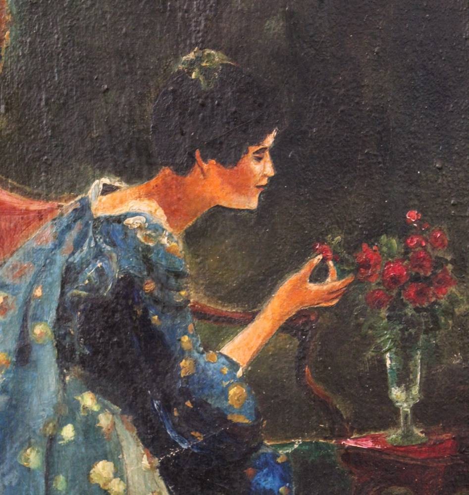 A.Reimann 1924, Dame in blauen Gewand, wohl nach V.Schramm, Öl/Leinwand, gerahmt, RG 74 x 54,5cm, restau.bedürftig